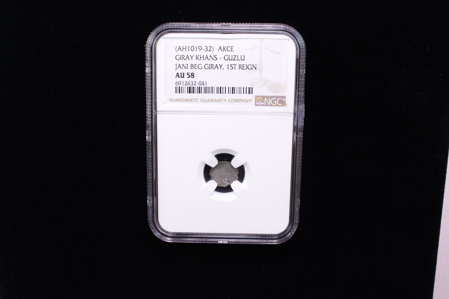 GIRAY KHANS: Jani Beg Giray, 1610-1623, AR akce (0.22g), Guzlu, ND (1610-23), A-2079.1, NGC graded AU58.