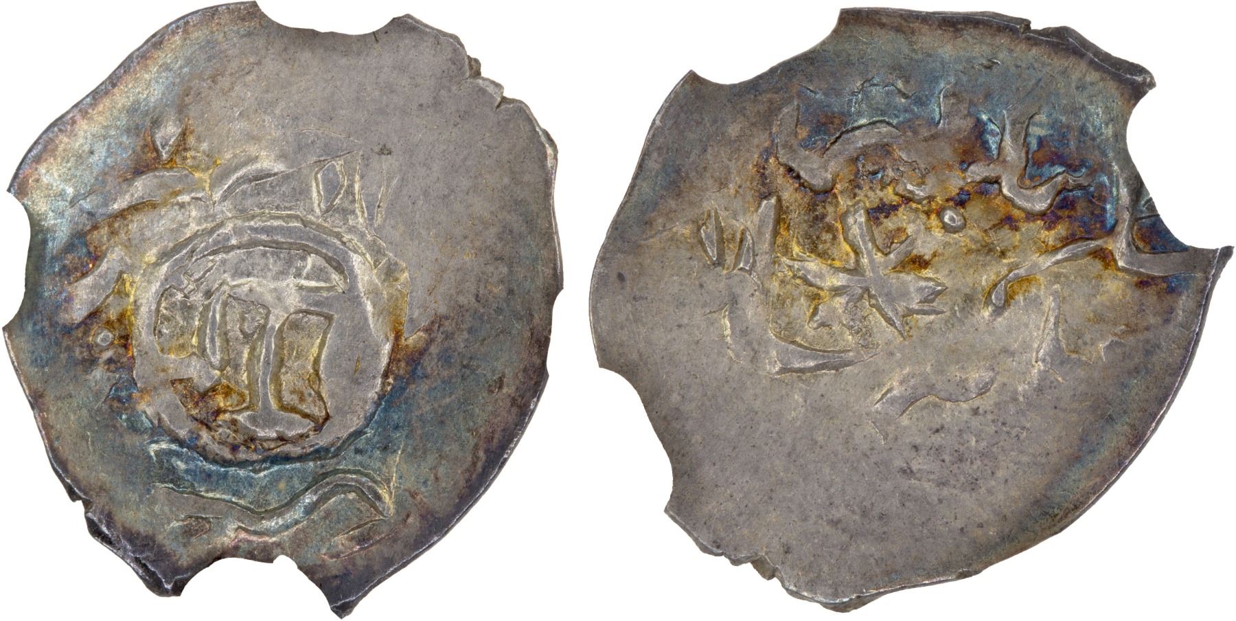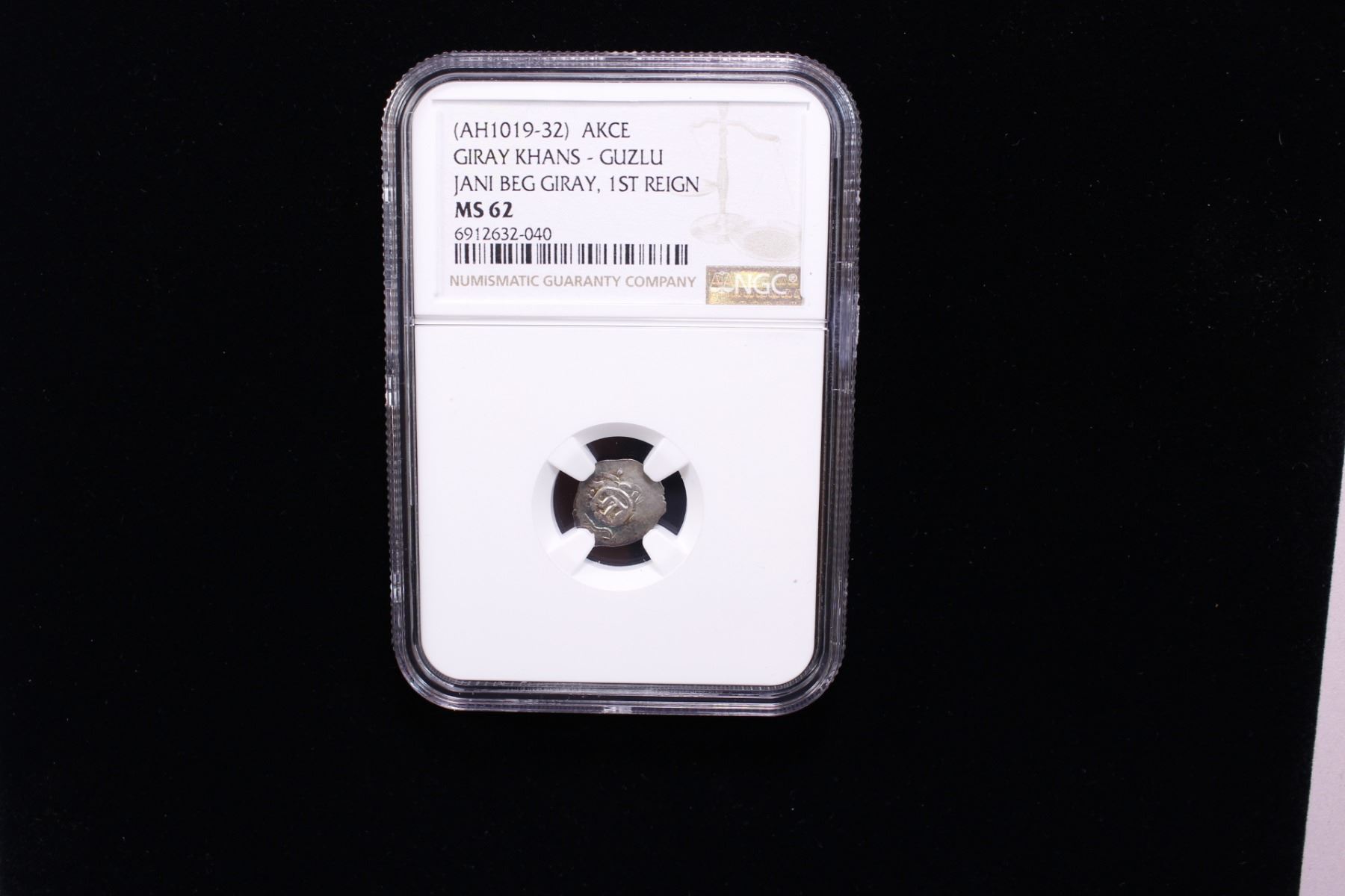 GIRAY KHANS: Jani Beg Giray, 1610-1623, AR akce (0.29g), Guzlu, ND (1610-23), A-2079.1, lightly lustrous with iridescent toning, NGC graded MS62.