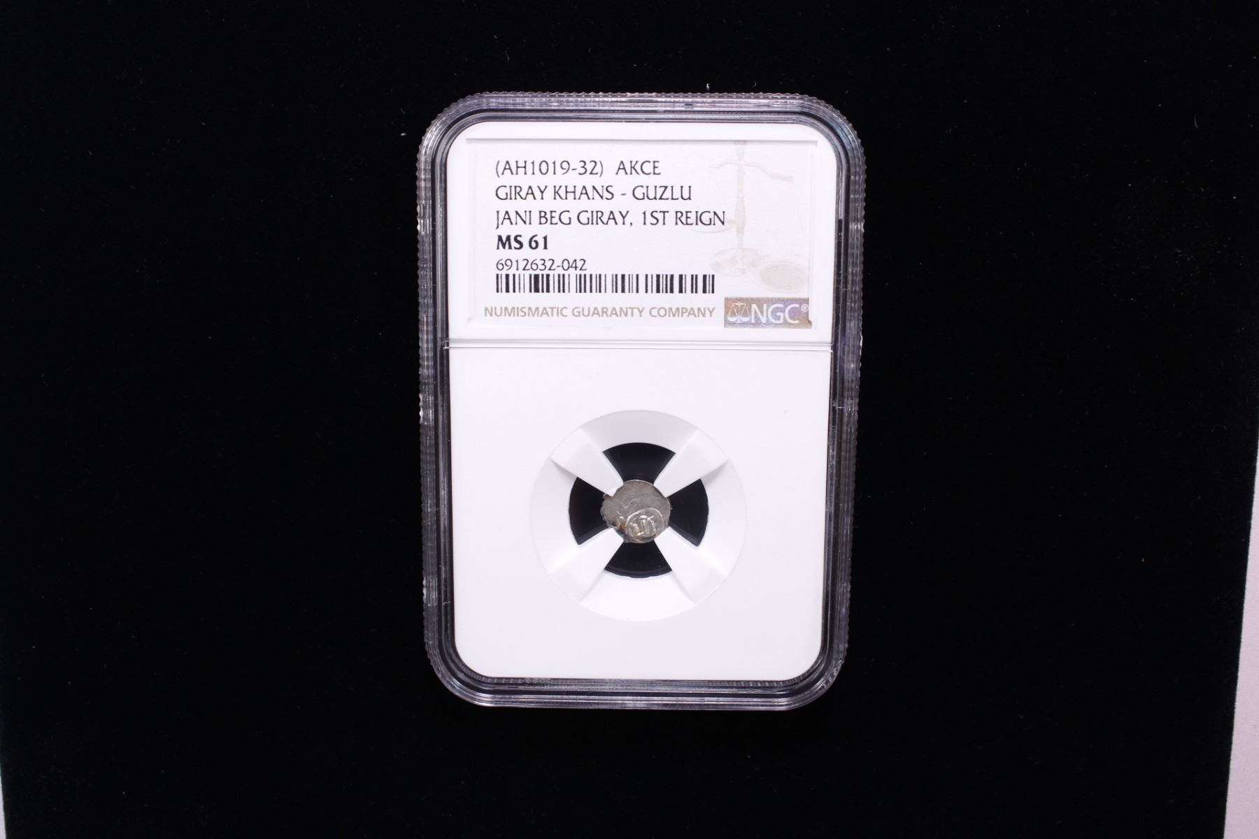 GIRAY KHANS: Jani Beg Giray, 1610-1623, AR akce (0.31g), Guzlu, ND (1610-23), A-2079.1, lightly lustrous, NGC graded MS61.