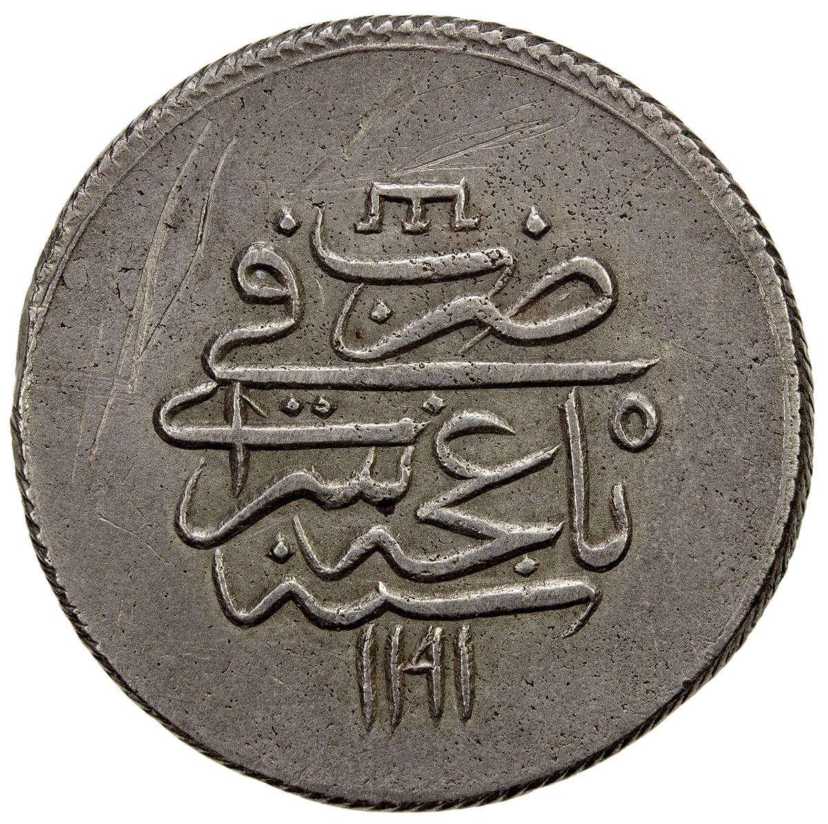 GIRAY KHANS: Shahin Giray, 1777-1783, AR 40 para (piaster, ghrush, ½ rouble) (14.90g), Baghcha-Saray, AH1191 year 5, A-2112, Ret-162/164var, cf. Sariev-457/460, 3rd monetary series; standard obverse (similar to Sariev-329 of the 2nd series), toughra reverse with ornate flower left & right with fancy floral sprig below the toughra, oblique reeding, couple small scratches in upper left field on the obverse, superb strike, finest style, unknown to Sariev and apparently unpublished, lovely EF, RRRR, ex Dick Nauta Collection, from our price list #57, Lot 568 (1989).