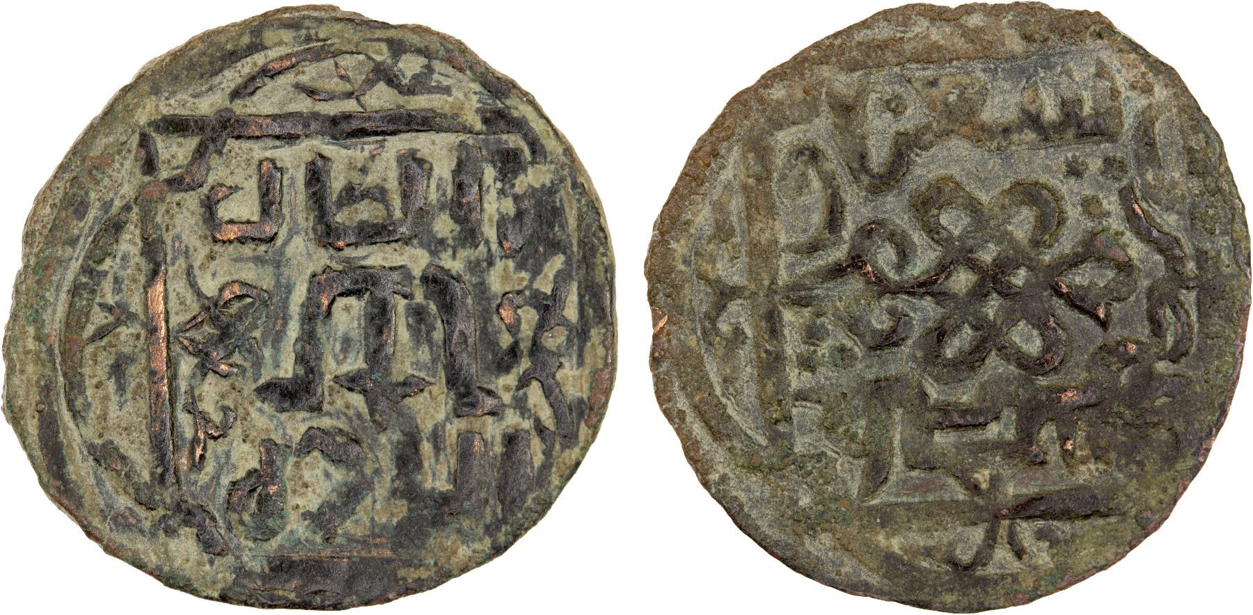 GOLDEN HORDE: Anonymous, ca. 1370-1390, AE pul (1.36g), Sighnaq, ND, A-2062S, Zeno-284233, tamgha between al-sultan / al-'adil // mint formula around central ornament; assigned on Zeno to the reign of Mubarak Khwaja Khan, 1366-1367, VF, RRR.