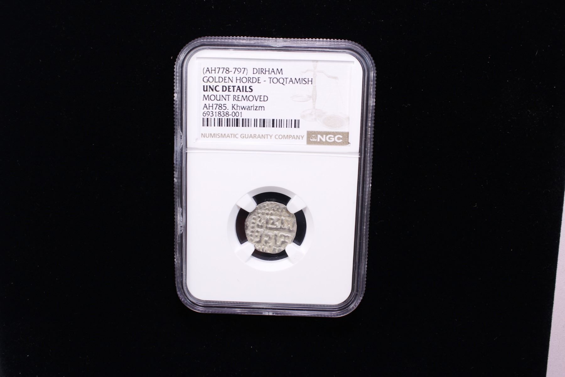 GOLDEN HORDE: Toqtamish, 1376-1395, AR dirham ("miri"), Khwarizm, AH785, A-2048K, mount removed (noticeable only at the edge), NGC graded UNC details.