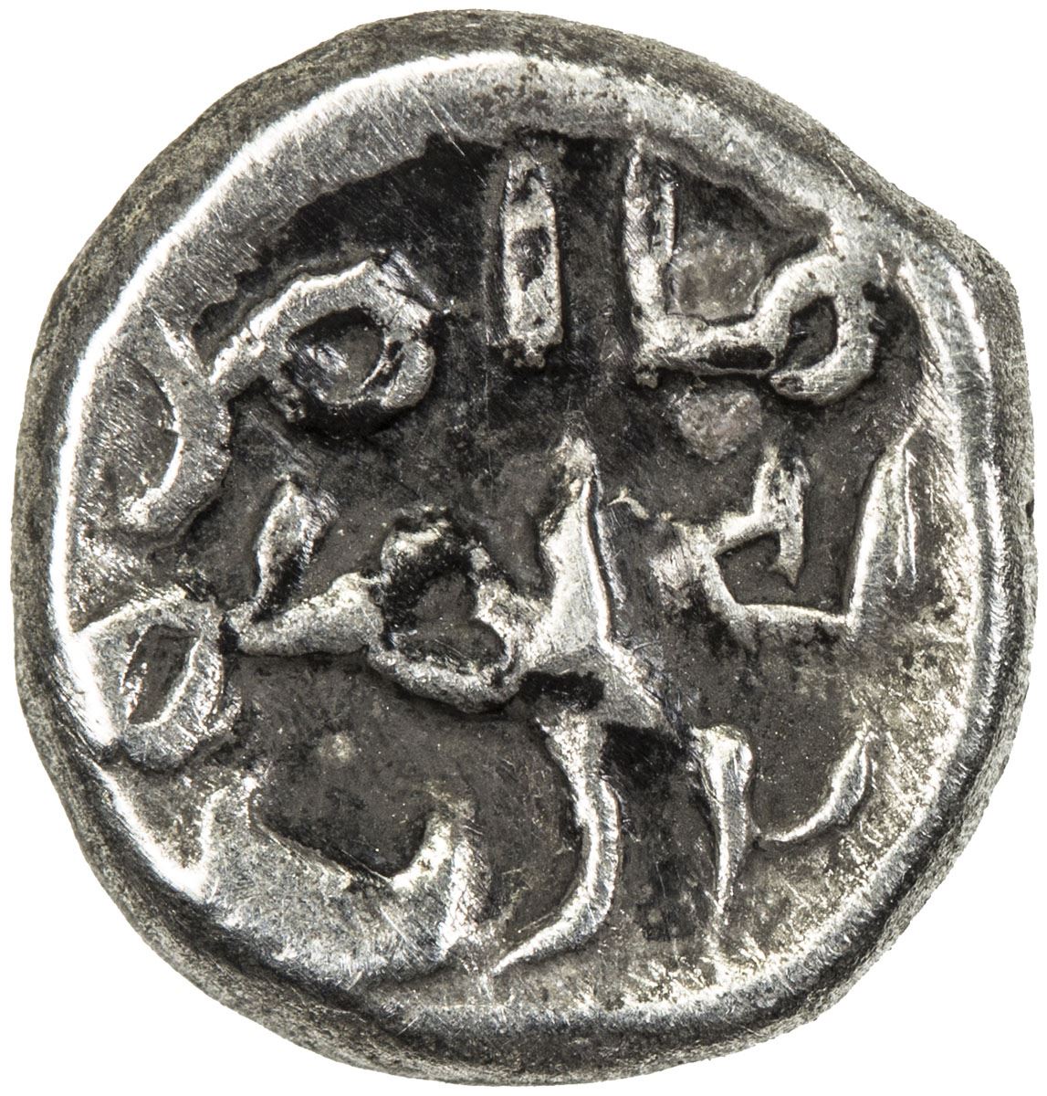 GOVERNORS OF SIND: Tamim b. Zayd al-'Utbi, ca. 728-730, AR damma (0.34g), NM, ND, A-O1493, obverse text Allah ahad Allah al-samad // reverse mâ amara bihi tamim bin zayd, with just mâ instead of the full word mimmâ, VF, RRR, ex M.H. Mirza Collection.