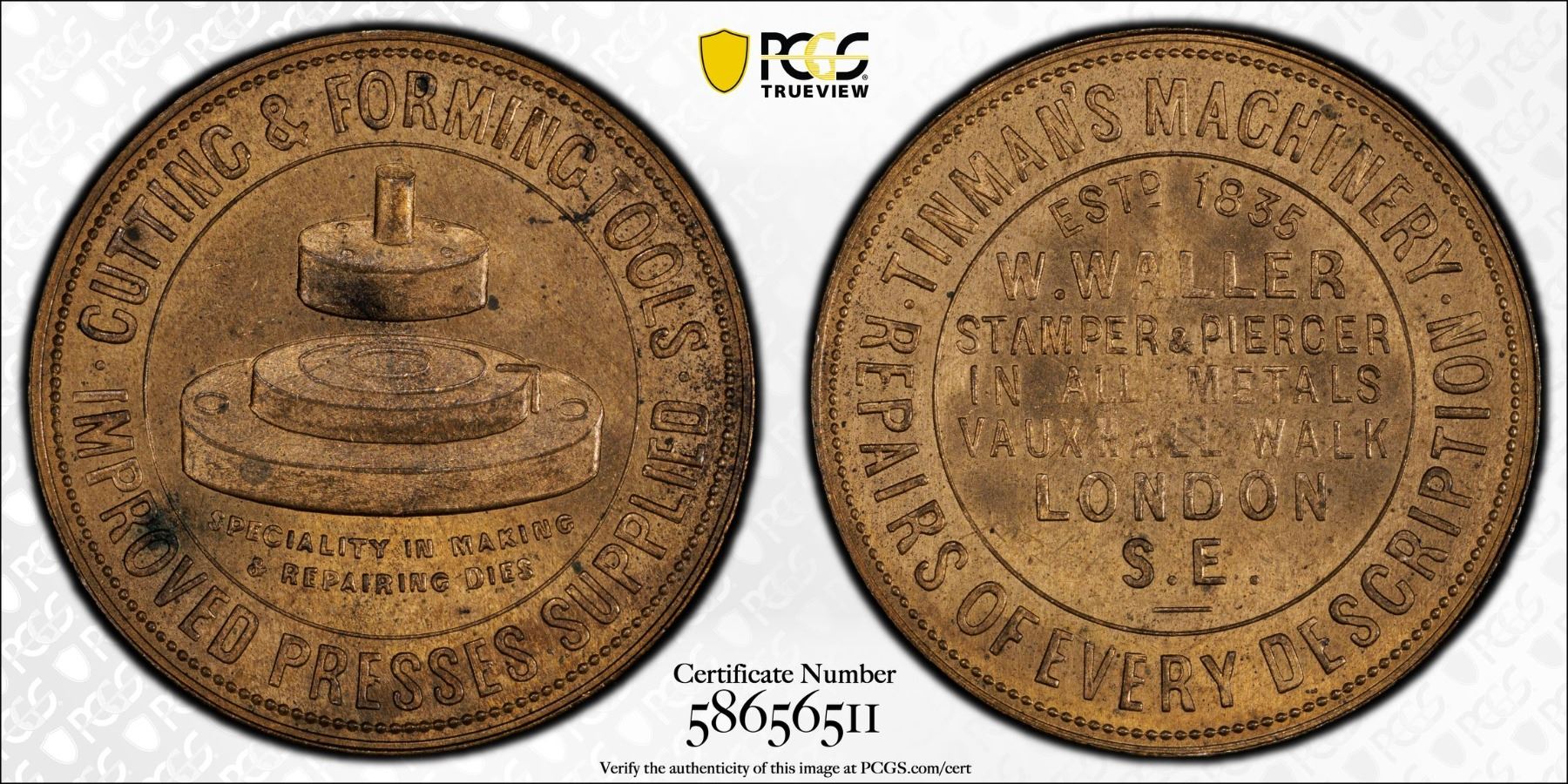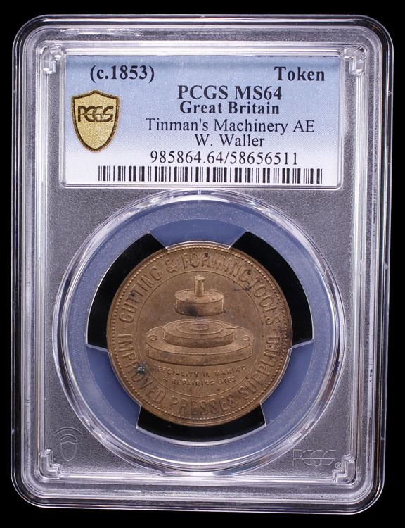 GREAT BRITAIN: AE advertising token, ND, 30mm, CUTTING & FORMING TOOLS / IMPROVED PRESSES SUPPLIED around machine press, SPECIALITY IN MAKING / & REPAIRING DIES below // TINMANS MACHINERY, REPAIRS OF EVERY DESCRIPTION in outer legend, ESTd 1835 / W. WALLER / STAMPING & PIERCER / IN ALL METALS / VAUXHALL WALK / LONDON / S. E., a wonderful mint state example! PCGS graded MS64. W. Waller, a tinman and metal worker established in 1835 at 30-32 Vauxhall Walk, London, offered machinery, repairs, stamping, and piercing services.