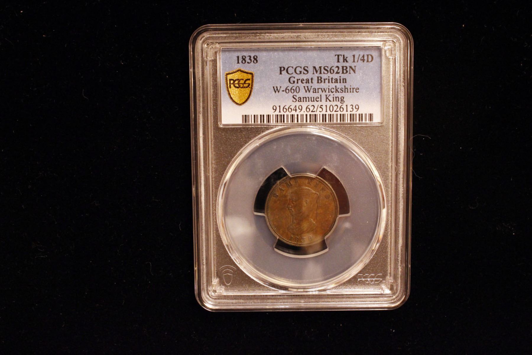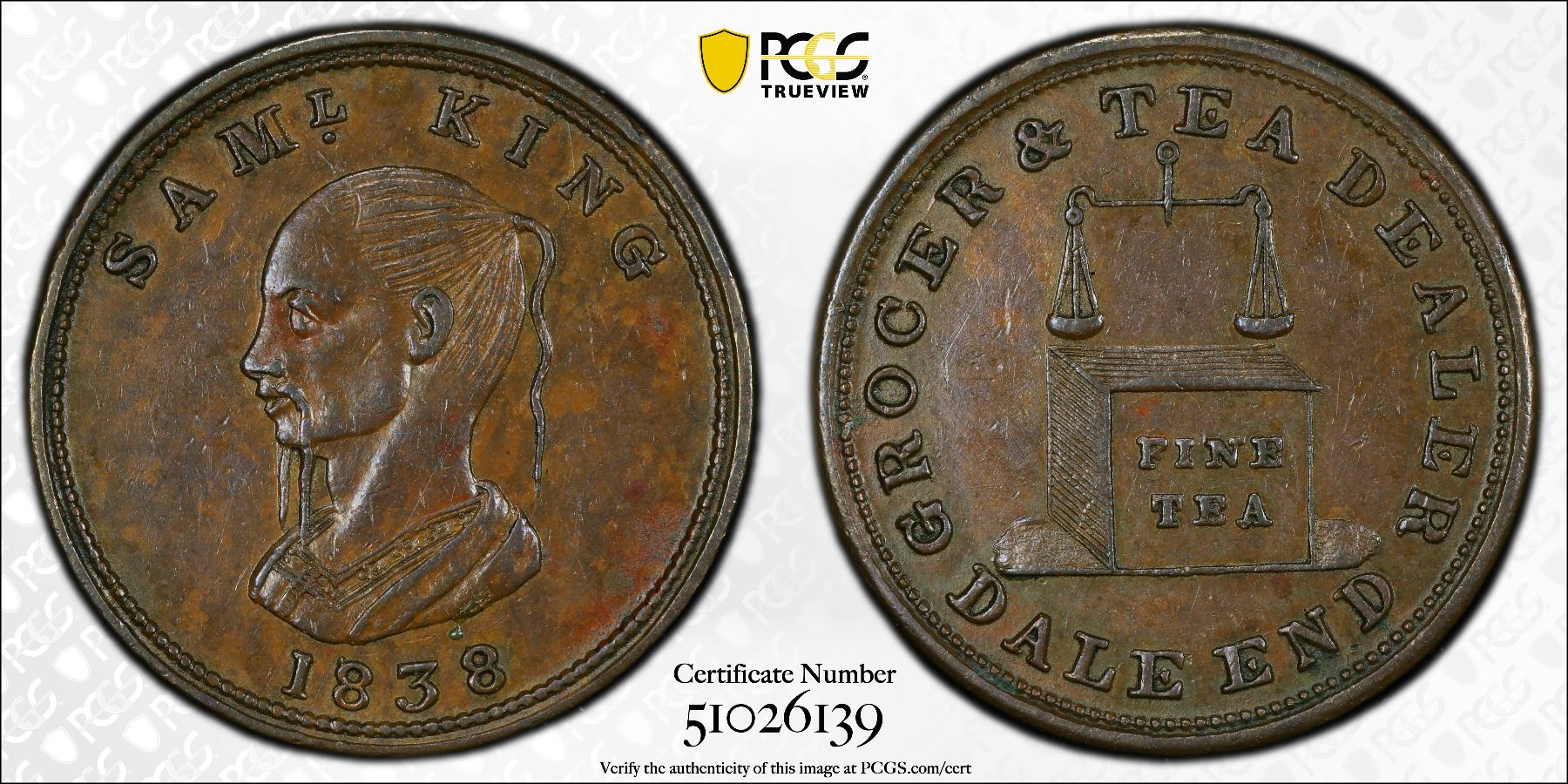 GREAT BRITAIN: AE farthing token, 1838, Withers-660, Batty-904, Samuel King Dale End, Birmingham, portrait with queue and long mustache SAML KING 1838 // scale over box on which FINE TEA, GORCER & TEA DEALER DALE END, Edge: plain, copper, 20mm, PCGS graded MS62 BN.