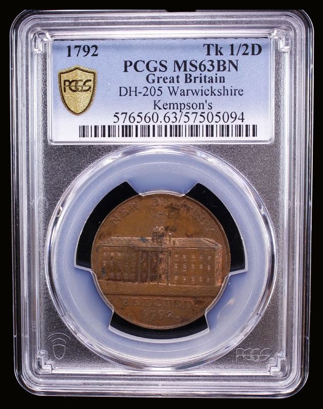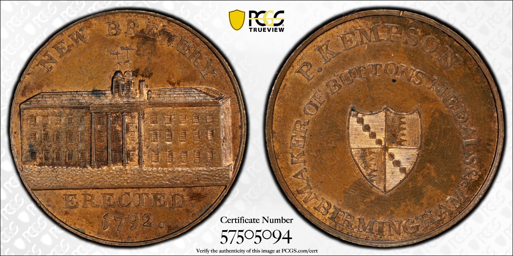 GREAT BRITAIN: AE halfpenny token, 1792, D&H-205 (Warwickshire), Conder token, Kempson's Series of Birmingham Buildings, New Brewery, with much of the original red luster, PCGS graded MS63 BN.