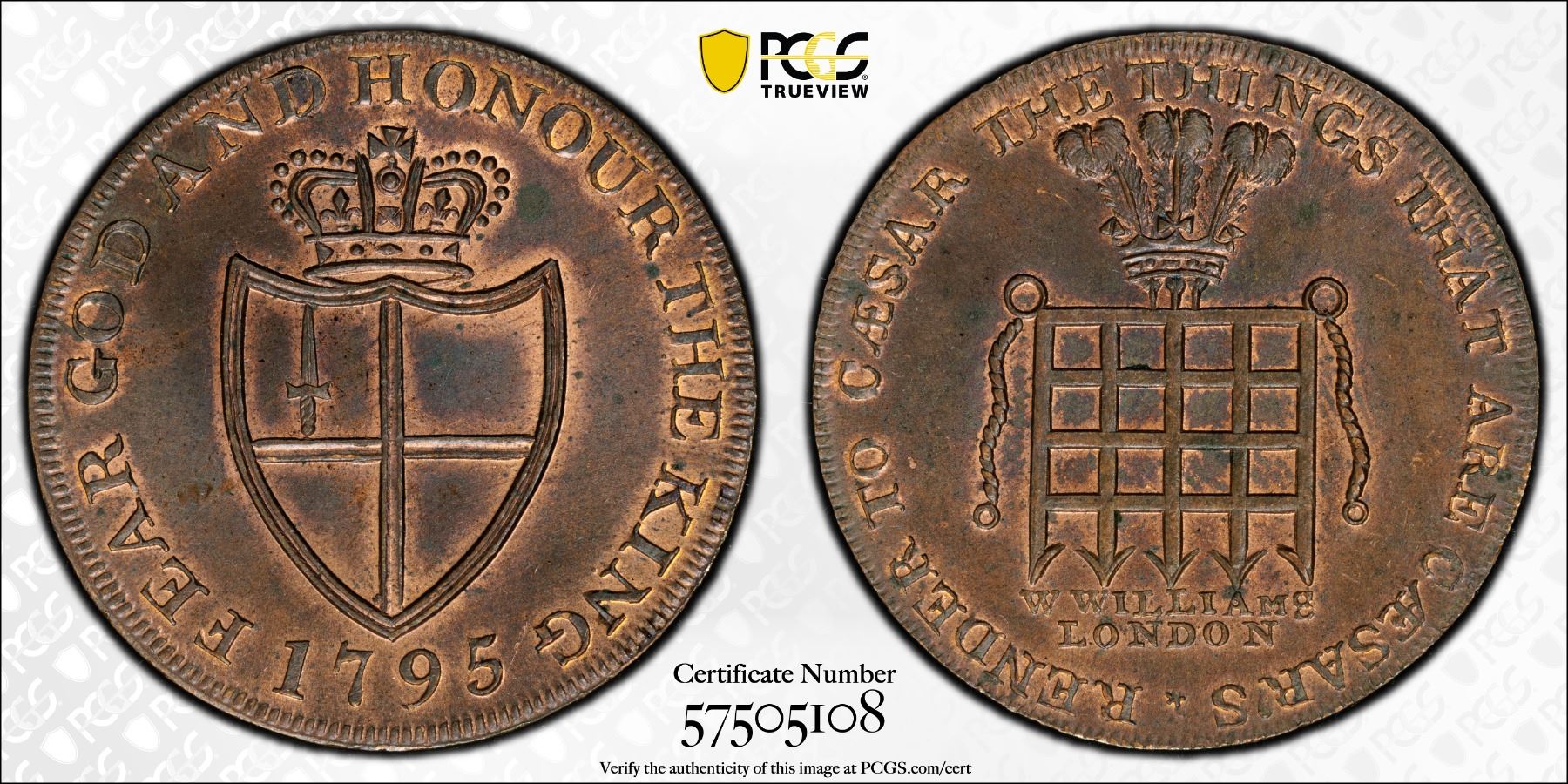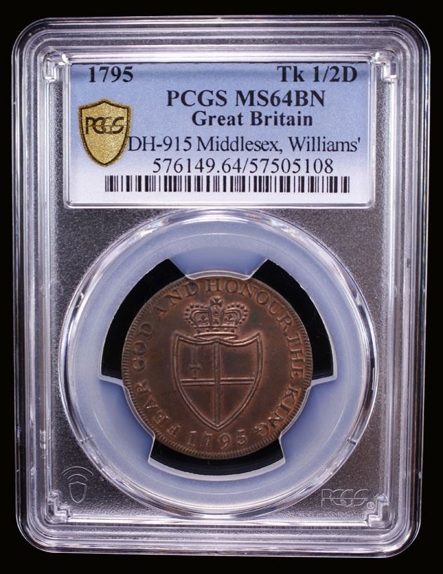 GREAT BRITAIN: AE halfpenny token, 1795, D&H-915 (Middlesex), Conder token, William Williams (knife-sharpener & button manufacturer) of London, crowned shield // portcullis surmounted with plumes, a lovely example with some red luster, PCGS graded MS64 BN. John Horne Tooke (1736-1812) was a clergyman and radical reformer. He was one of the three defendants in the 1794 Treason Trials arranged by the government of William Pitt the Younger. All three were brilliantly defended by Thomas Erskine and subsequently acquitted of high treason.