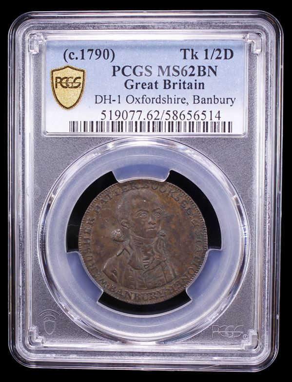 GREAT BRITAIN: AE halfpenny token, ND (1794), DH-1, Banbury, Oxfordshire, William Rusher; WM. RUSHER HATTER BOOKSELR & STATIONER / BANBURY around three-quarter right facing bust of William Rusher, with longish hair and a high cravat // DEUS EST NOBIS SOL ET SCUTUM around Borough’s emblem of the sun with rays and a face in its center enclosed in a circle, PAYABLE AT BANBURY OXFORD OR READING on edge, a pleasing mint state example, PCGS graded MS62 BN. Although this token is undated, it is likely to have been struck in 1794, the year William Rusher set up his shop in the market place in Banbury. A contemporary advertisement in Jackson's Oxford Journal, for 13 November 1794, offers quite a revealing glimpse of the scope of William’s business at that particular moment: "All kinds of Books and Stationery, Mens and Boys Hats, Gold Rings, Silver Goods, Plated Buckles, Looking Glasses etc. etc. now selling cheap at William Rusher’s (the late Mr White’s shop) in the Market Place, Banbury."