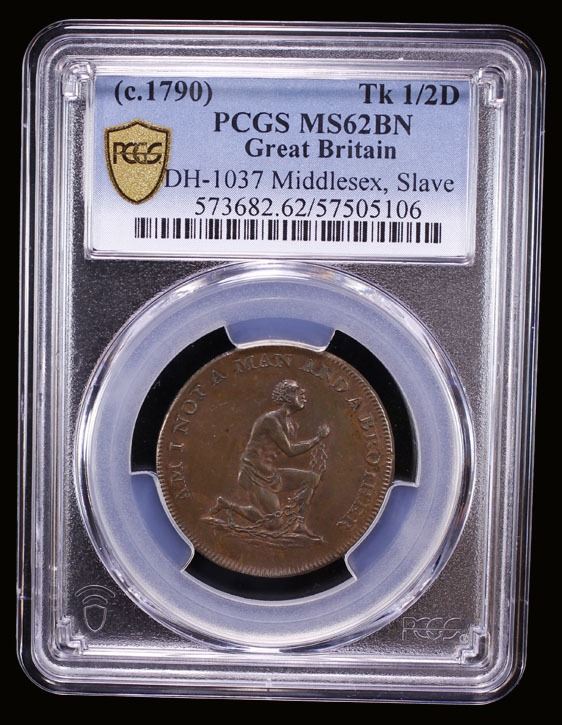 GREAT BRITAIN: AE halfpenny token, ND (ca. 1790), D&H-1037 (Middlesex), Conder token for the Abolition of Slavery, enslaved man in chains kneeling right, AM I NOT A MAN AND A BROTHER // two clasped hands with MAY SLAVERY & OPPRESSION CEASE THROUGHOUT THE WORLD around, PAYABLE AT DUBLIN OR LONDON on edge, PCGS graded MS62 BN.
