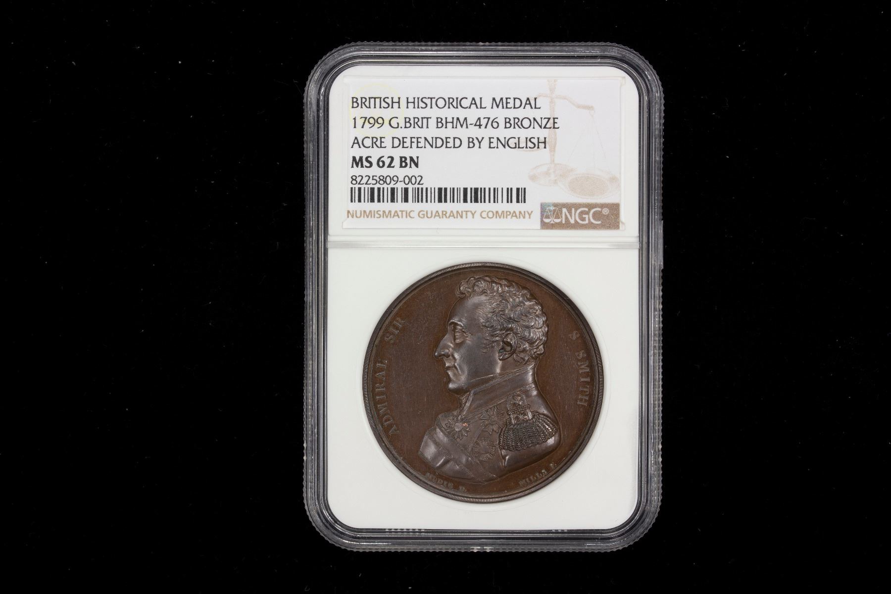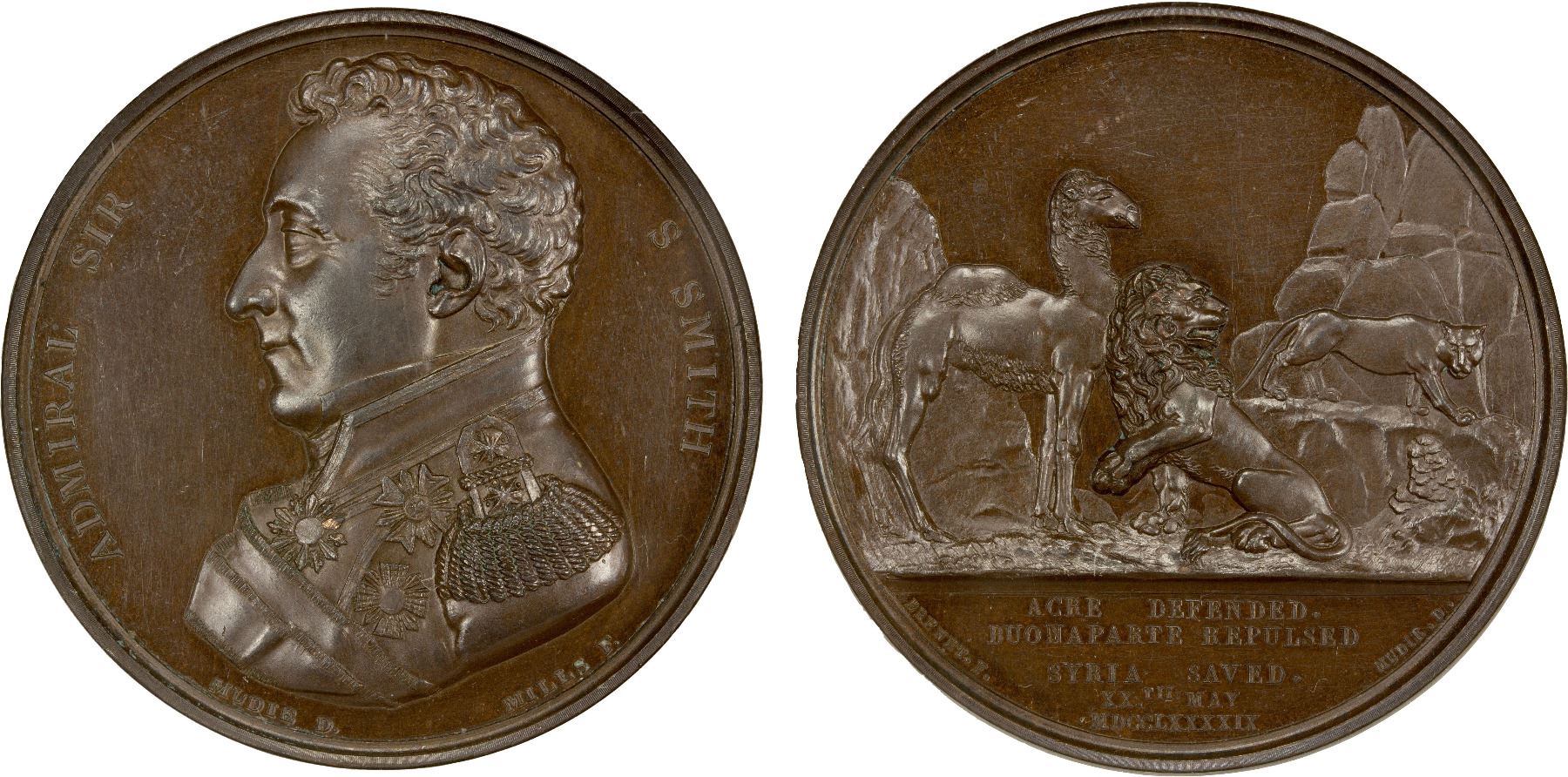 GREAT BRITAIN: AE medal, 1799, Eimer-906, BHM-476, Mudie-7, 41mm bronze medal by by G. Mills and N. G. A. Brenet, for Mudie's series of National Medals - Siege of Acre; ADMIRAL SIR S SMITH, uniformed bust left // lion within a rocky pass, protects a camel from a menacing tiger, ACRE DEFENDED. / BUONAPARTE REPULSED / SYRIA SAVED. / XX. TH MAY / MDCCLXXXXIX in exergue in five lines, a pleasing mint state example, NGC graded MS62 BN. Once the siege began in late March 1799, Admiral Sir Sidney Smith anchored HMS Tigre and Theseus so their broadsides could assist the defence. The siege of Acre was an unsuccessful French siege of the Ottoman city of Acre and was the turning point of Napoleon's invasion of Egypt and Syria, along with the Battle of the Nile.