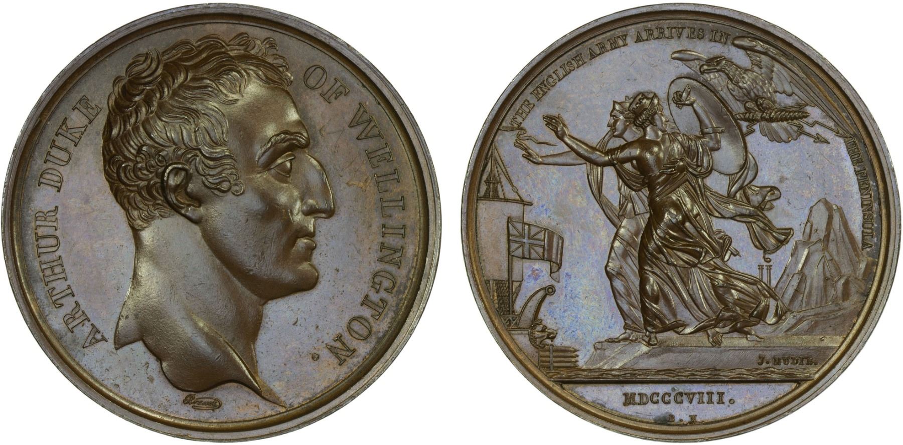 GREAT BRITAIN: AE medal (30.85g), ND (1820), Bramsen-413, Eimer-1a, BHM-635, 41mm bronze medal by Mudie for the Arrival of the British Army on the Iberian Peninsula; ARTHUR DUKE / OF WELLINGTON around bust of same facing right, variety without MUDIE below truncation // THE ENGLISH ARMY ARRIVES IN THE PENINSULA, British ship approaching personifications of Spain and Portugal, French eagle attacking from upper right; in exergue MDCCCVIII, Unc. Number 12 of Mudie's National Medals, "Grand Series of Forty Medals Commemorating British Victories" which were published by J. Mudie and manufactured by E. Thomason in 1820.