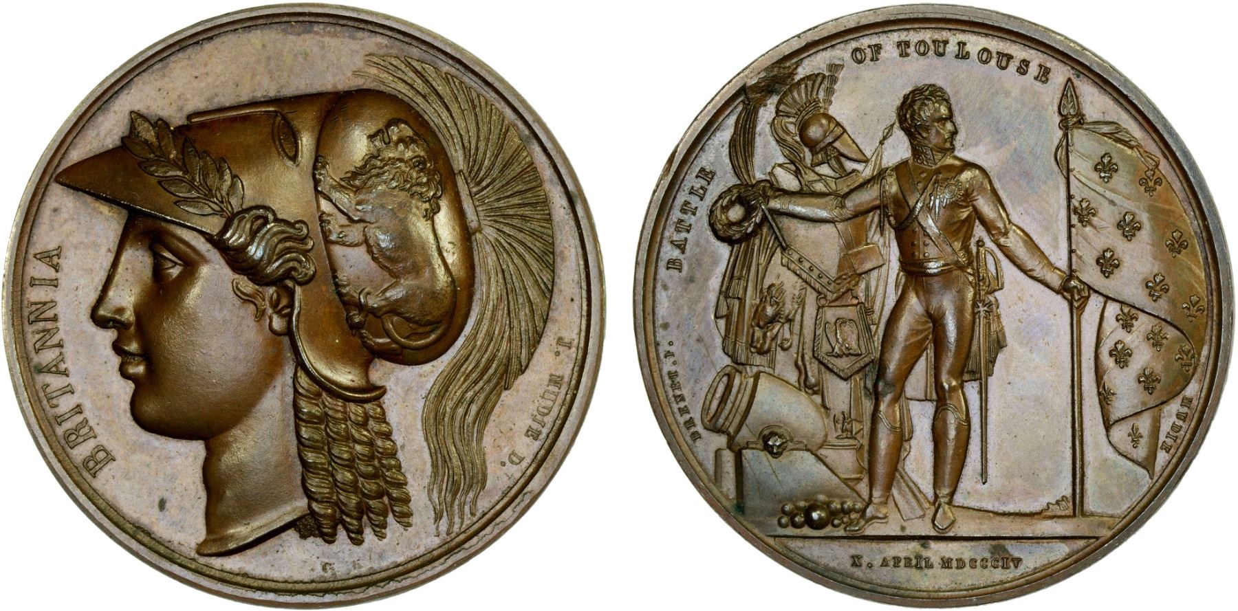 GREAT BRITAIN: AE medal (37.53g), Paris, 1804 (1814), BHM-789, Eimer-1042, Mudie-26, 41mm bronze medal on the Battle of Toulouse by Mudie and Brenet, bust of Britannia left wearing Corinthian helmet with BRITANNIA at left margin // Wellington standing slightly left with head right, with stacked arms behind at left and holding fleur-de-lis flag at right, and holding laurel wreath and palm leaf in right hand, with BATTLE - OF TOULOUSE around and X. APRIL MDCCCIV (sic) in exergue, plain edge, Choice AU, ex Donald Young (with tag). Part of the 40-medal series celebrating British victories, issued in 1820.