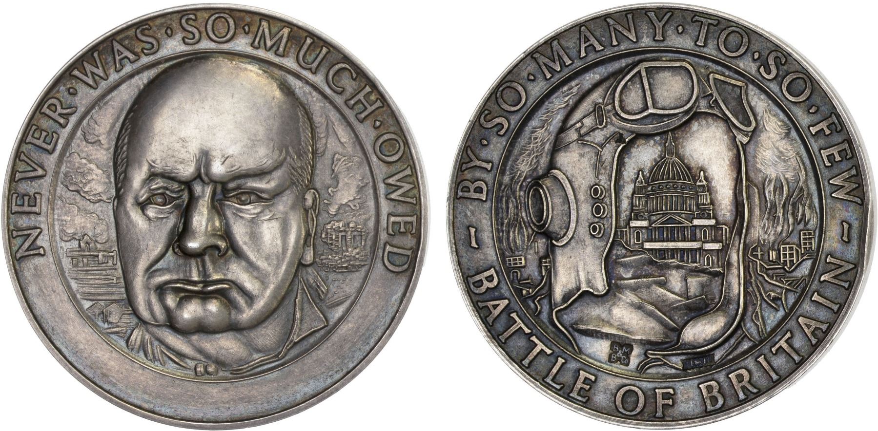 GREAT BRITAIN: AE medal (44.98g), ND (1965), Engstrom-55B, 38mm silver medal on the Battle of Britain and the Death of Winston Churchill by Roy Bradshaw, facing bust of Churchill within inner circle with NEVER WAS SO MUCH OWED around // aviator's cap with goggles framing St. Paul's Cathedral, with flaming ruins of London to left and right and BY SO MANY TO SO FEW - BATTLE OF BRITAIN around, a few hairlines, authorized mintage of 3,500 pieces, scarce, lightly toned, "1610" on edge, Unc.