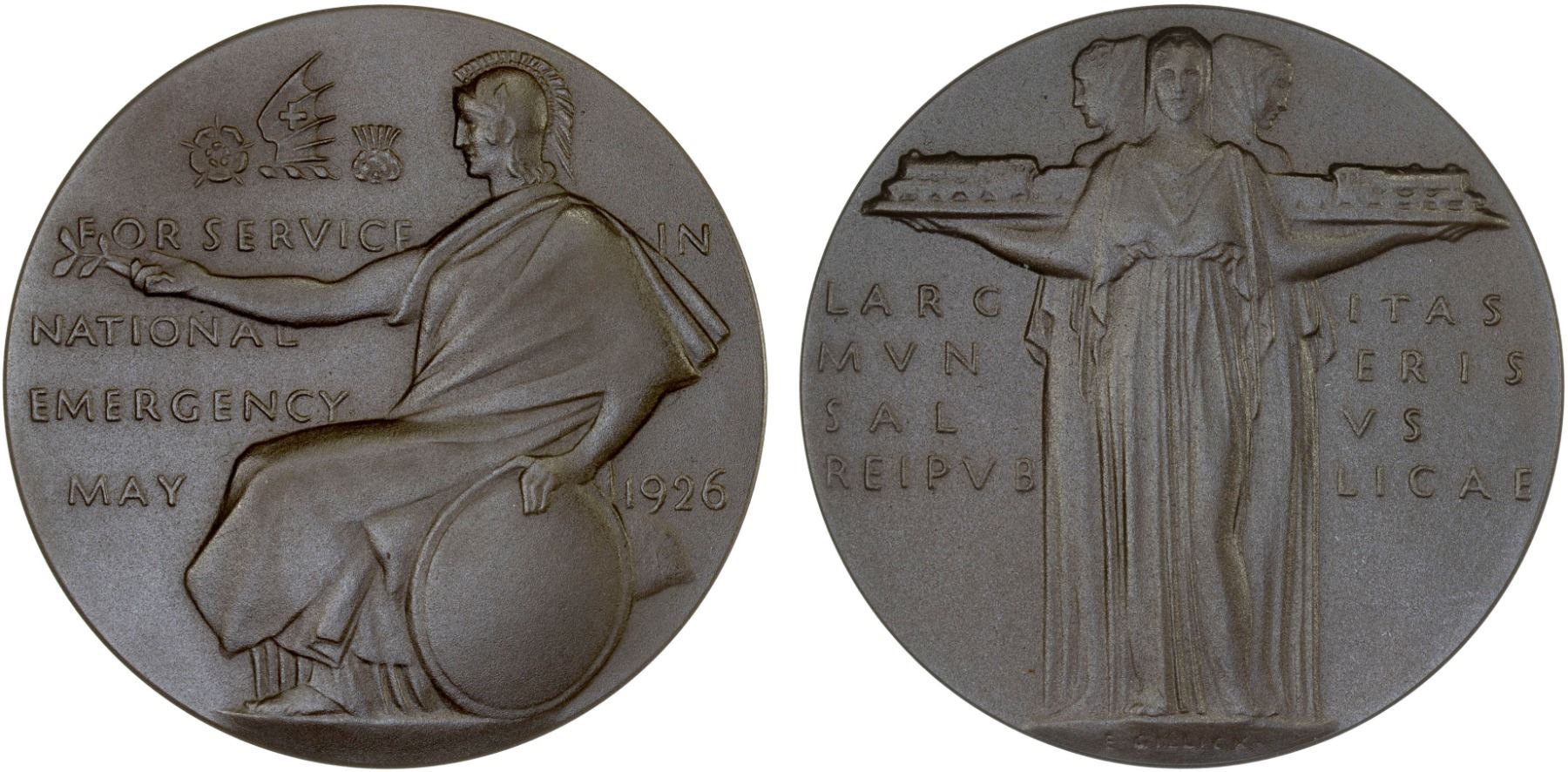 GREAT BRITAIN: AE medal (64.45g), 1926, BHM-4210, Eimer-2003, 51mm bronze medal on the National Emergency by Ernest G. Gillick for the London, Midland, & Scottish Railway, Britannia seated left with right arm extended holding laurel branch with "FOR SERVICE - IN / NATIONAL / EMERGENCY / MAY - 1926" in fields // three female figures holding two locomotives with LARG - ITAS / MVN - ERIS / SAL - VS / REIPVB - LICAE at sides, beautiful even chocolate-brown color, in original plush case, plain edge, Choice UNC. Included in this lot is a letter from the Railway regarding the recipient's help in the General Strike. Interestingly, the first letters of the 4-line Latin legend spell LMSR for the London, Midland, & Scottish Railway.