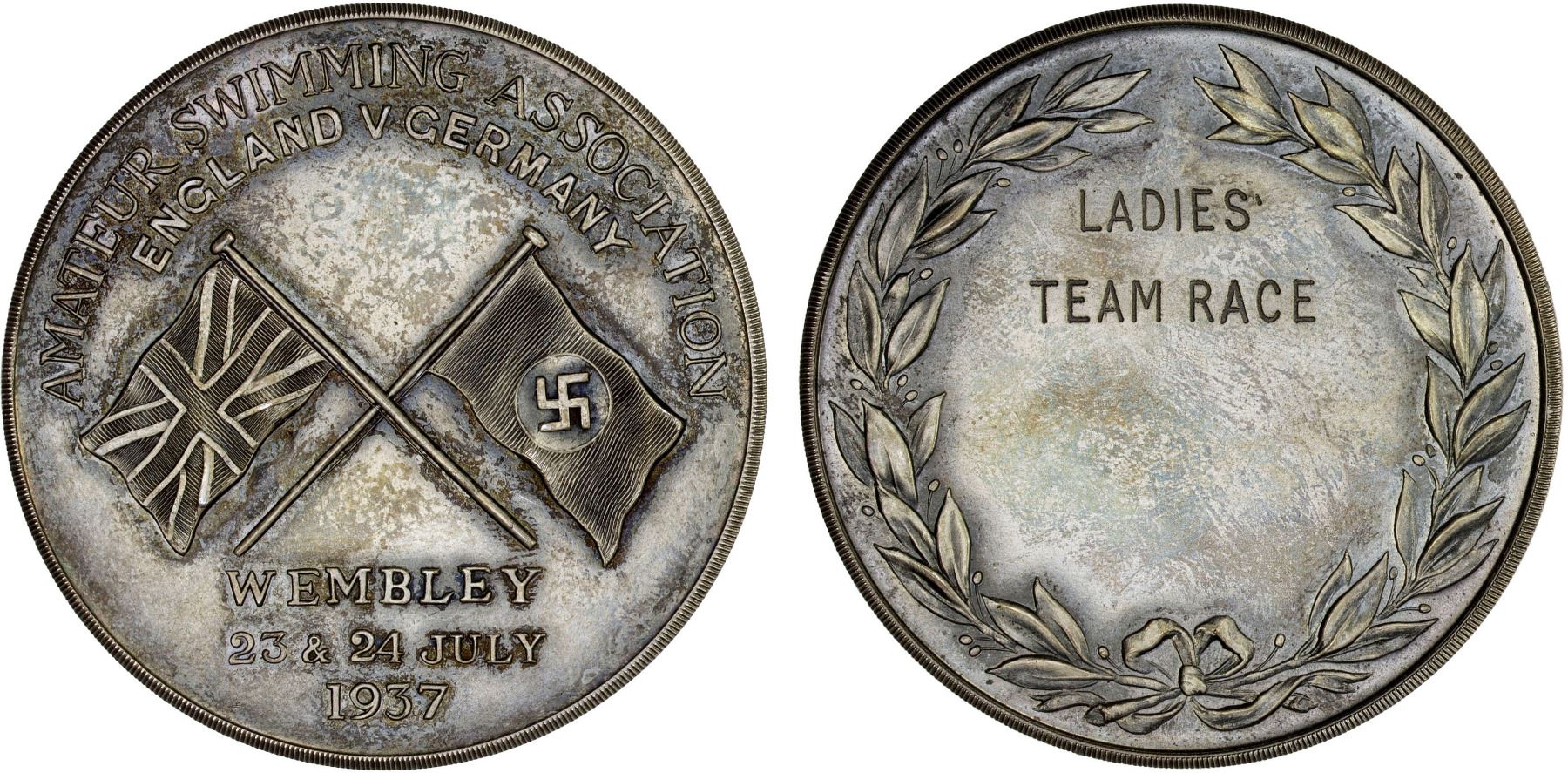 GREAT BRITAIN: AE medal (67.41g), 1937, 51mm unsigned silvered bronze award medal for the Amateur Swimming Association Meet between England and Germany at Wembley Stadium, crossed British and German (swastika) flags with AMATEUR SWIMMING ASSOCIATION / ENGLAND V GERMANY above and WEMBLEY / 23 & 24 JULY / 1937 below // (engraved) LADIES' / TEAM RACE with laurel wreath around, somewhat mottled toning, in original plush case, plain edge, Unc, ex Donald Young (with tag).