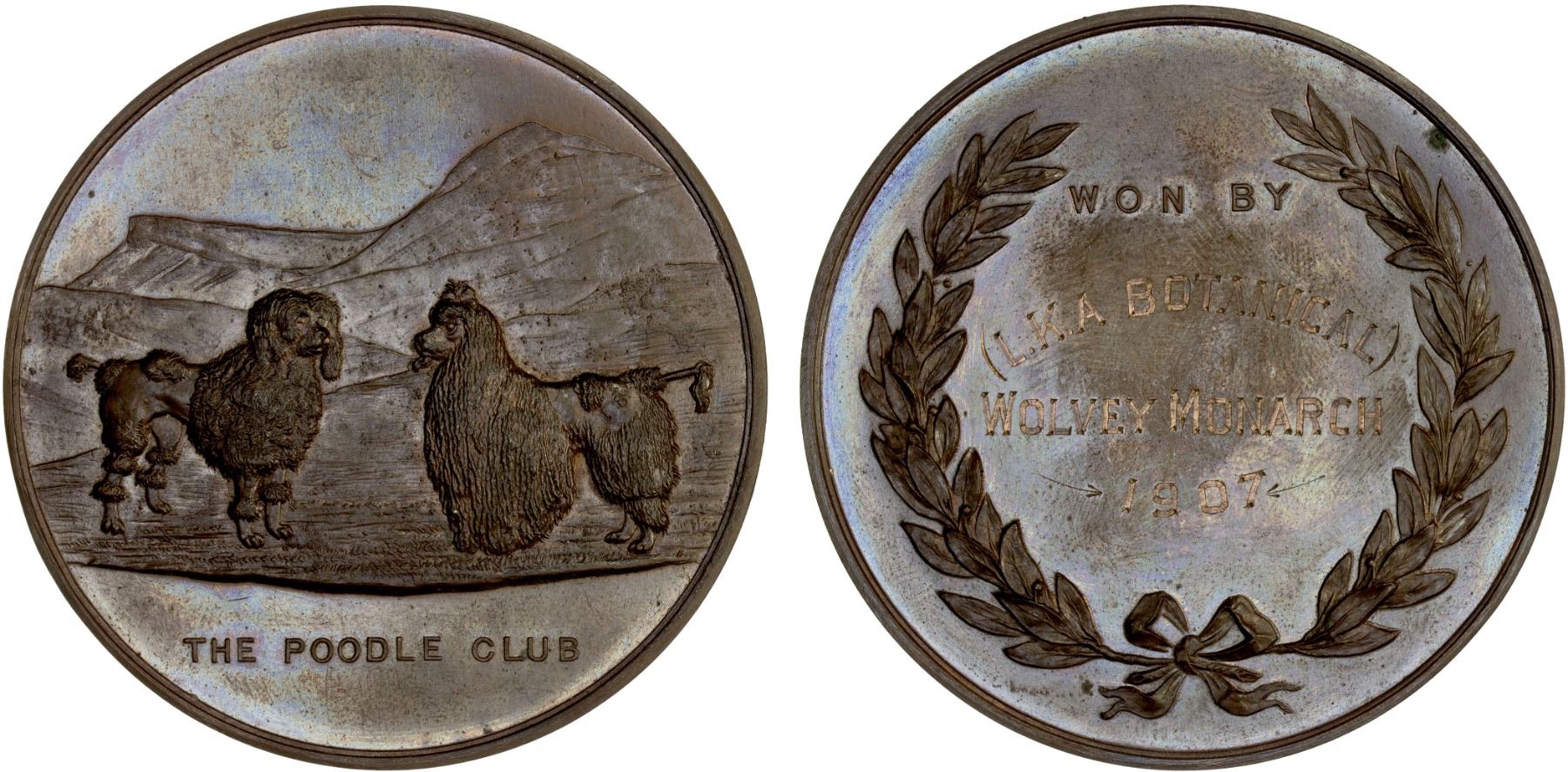 GREAT BRITAIN: AE medal (72.95g), 1907, cf. Noonan's Auction 275, Lot 2176, 57mm unsigned bronze award medal for The Poodle Club the London Kennel Association), two different poodle breeds standing facing each other with hills behind and THE POODLE CLUB in exergue // WON BY / (engraved) "(L.K.A BOTANICAL) / WOLVEY MONARCH / 1907" with laurel wreath around, small reverse spot and a few minor fingermarks, semi-prooflike, in original plush (broken) box, plain edge, Unc.
