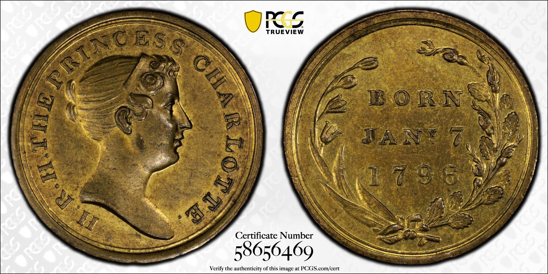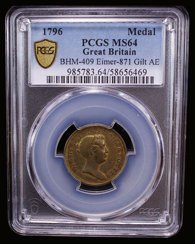 GREAT BRITAIN: AE medalet, ND (1817), Eimer-871, 22mm bronze medalet by Kempson & Son, Birmingham for the Death of Princess Charlotte; H. R. H. THE PRINCESS CHARLOTTE around diademed head of Princess Charlotte right // "BORN / JANY. 7 / 1796" within wreath, a wonderful mint state example! PCGS graded MS64. One of a set of four medals struck in 1817 to commemorate the death of Princess Charlotte.