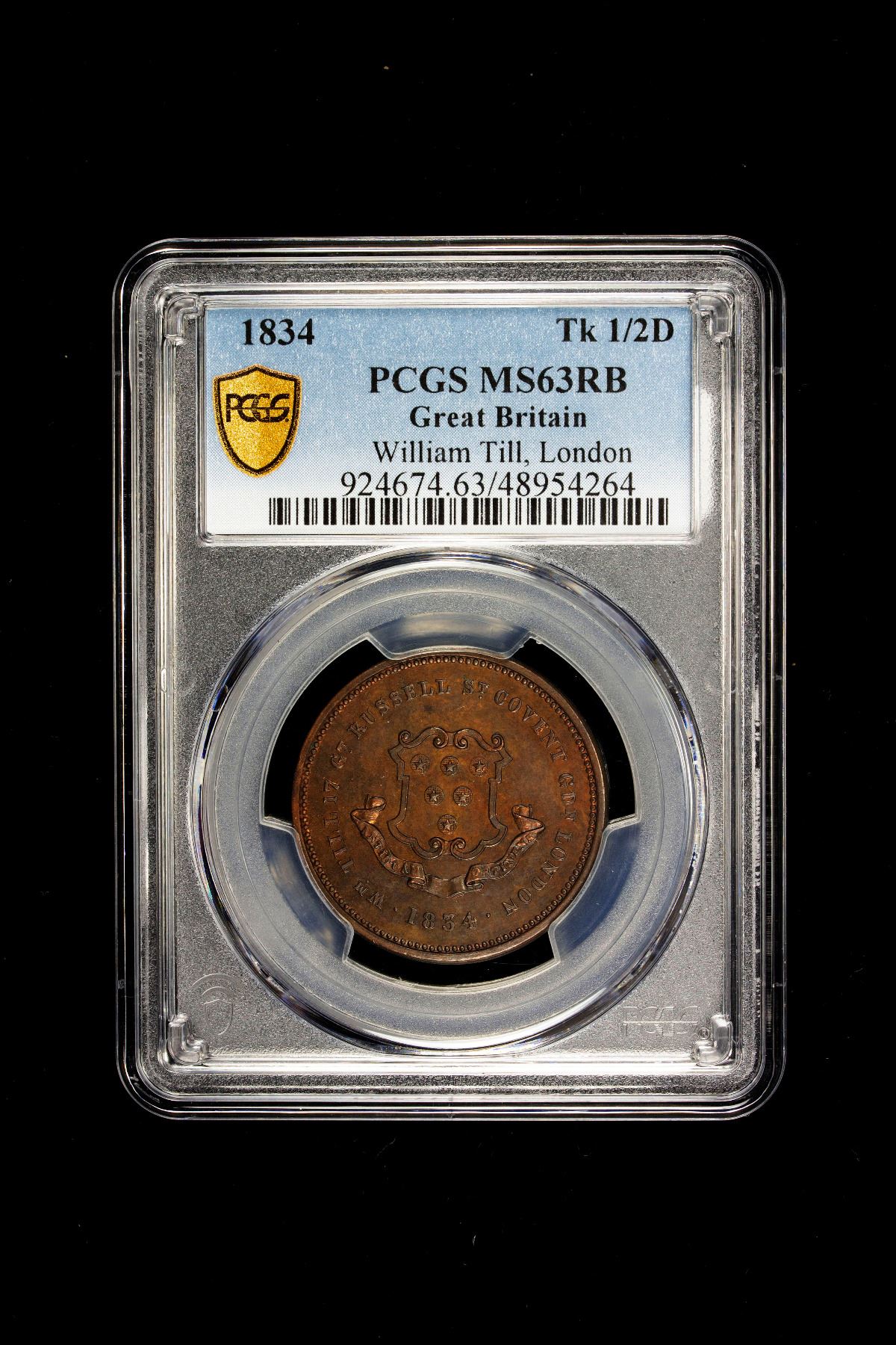 GREAT BRITAIN: AE token, 1834, Withers TB3 No: 3076, Mitchiner Jetons-8409, 30mm diameter in copper, Obverse: Legend in five lines within floral wreath DEALER IN ANCIENT & MODERN COIN MEDALS ANTIQUES &C. Reverse: Shield of Arms above banner ANTIQUAM OBTINENS, legend WM.TILL 17 GT. RUSSELL ST, COVENT GDN. LONDON. 1834. Plain edgea lovely example, PCGS graded MS63 RB.