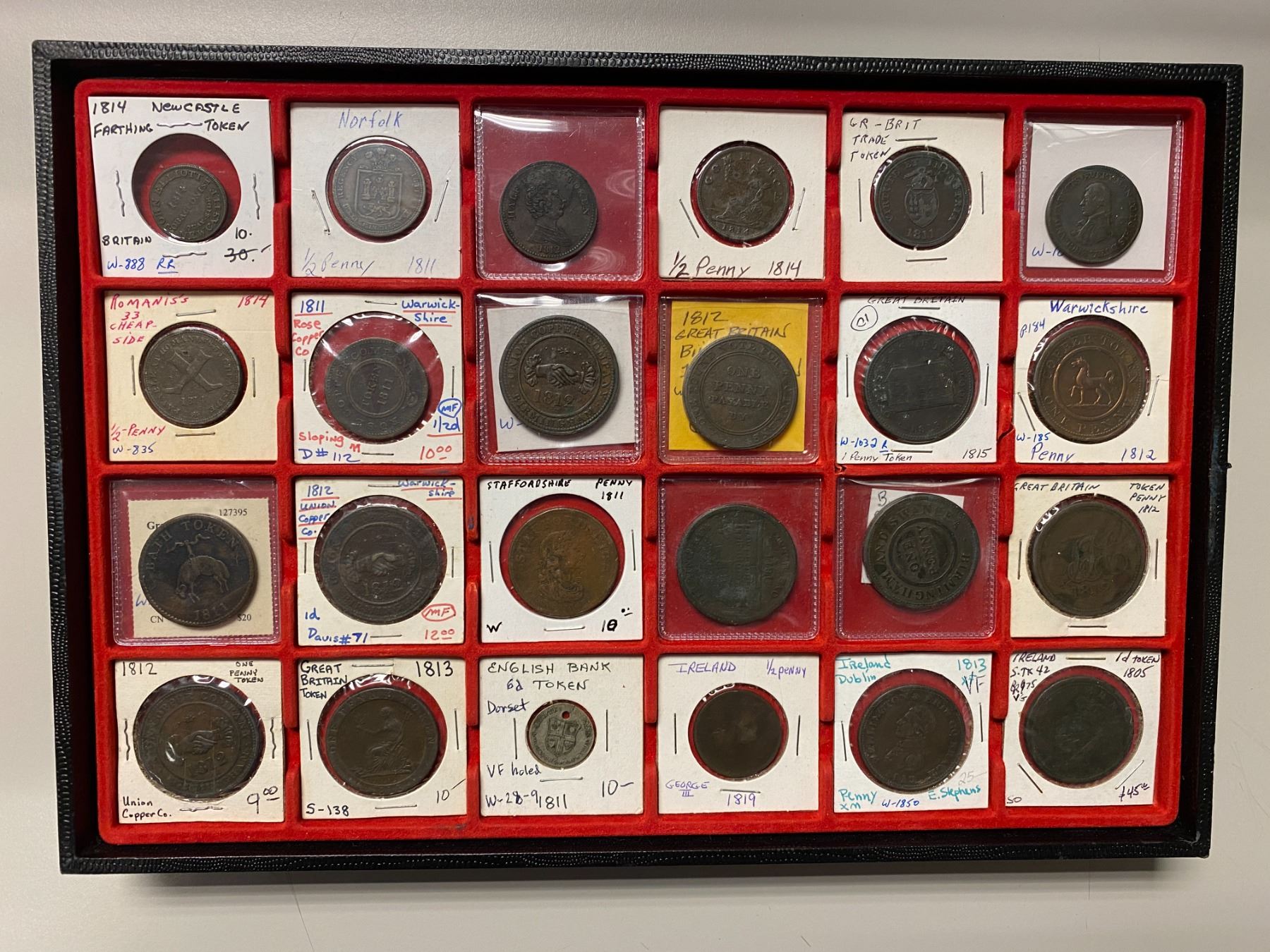 GREAT BRITAIN AND IRELAND: LOT of 24 tokens, all 1811-1820 tokens, including Great Britain: farthings (1 pc), halfpennies (7), pennies (12), and sixpences (1, silver, holed); and Ireland: halfpennies (1) and pennies (2); average circulated grades, with a few better, a few quite rare, in consignor's 2x2 holders, viewing recommended; retail value $275, lot of 24 pieces.