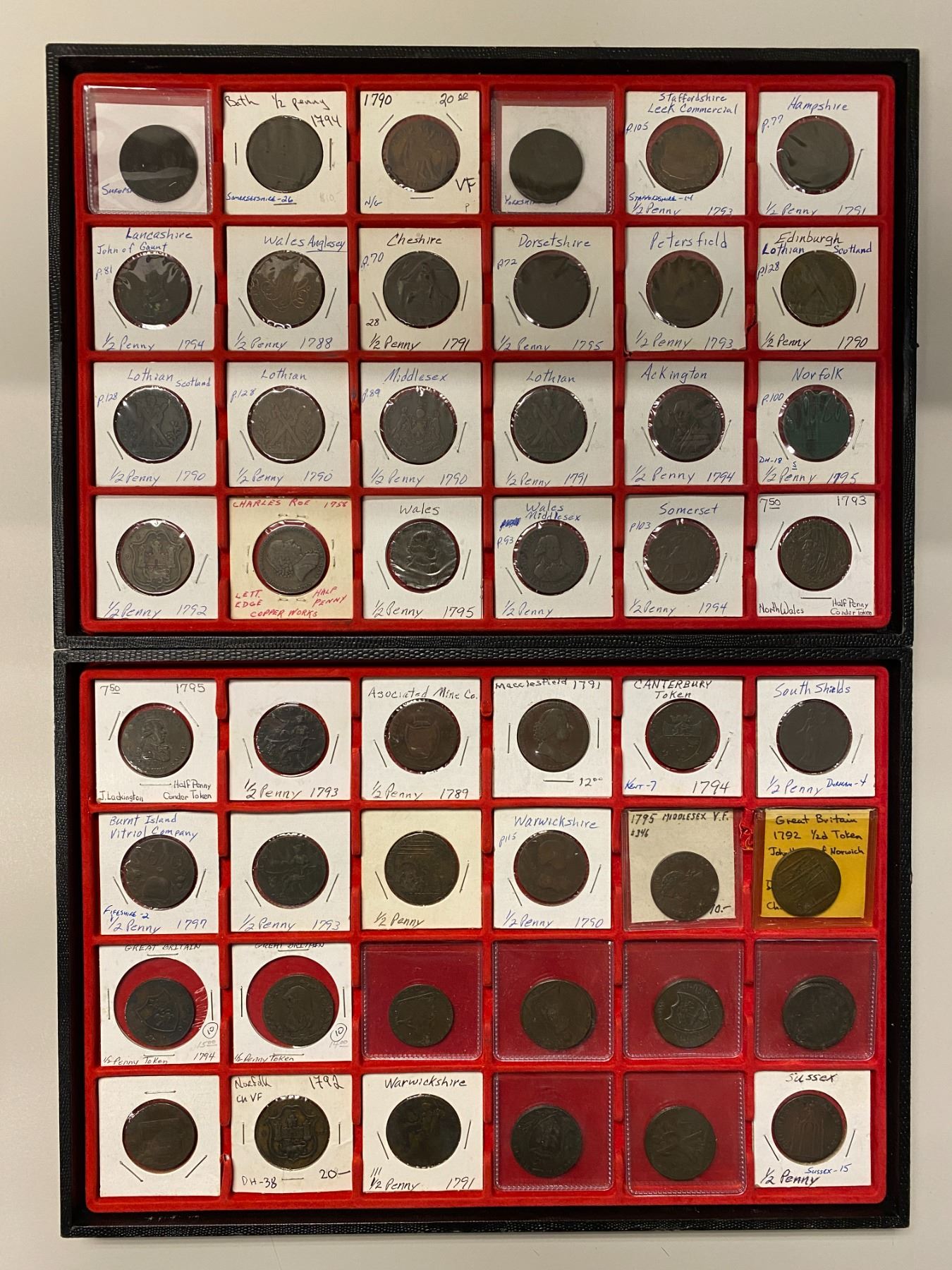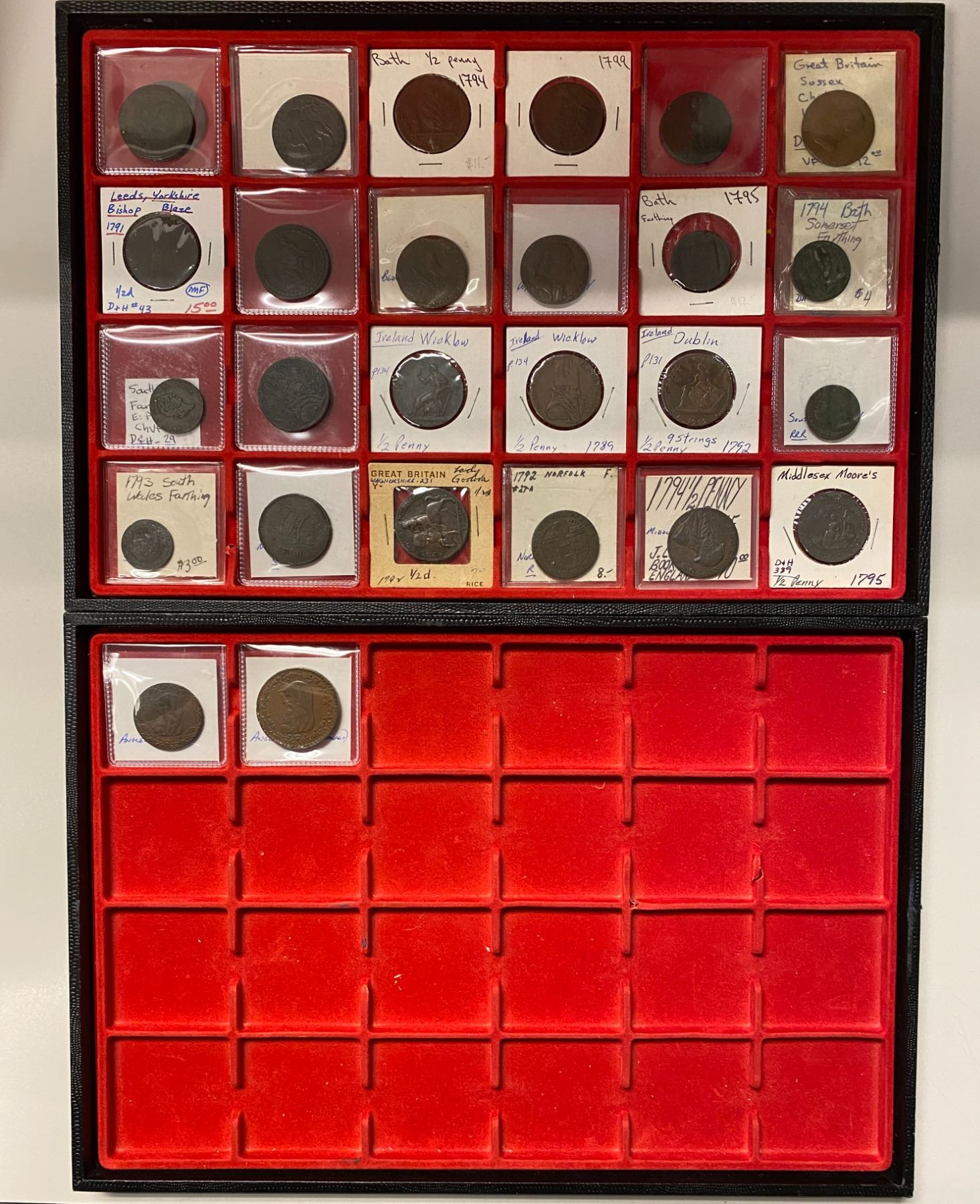 GREAT BRITAIN AND IRELAND: LOT of 79 tokens, all Conder tokens, including Great Britain: farthings (6 pcs), halfpennies (67), and pennies (1); and Ireland: halfpennies (5); average circulated grades, with some better, a few quite rare, including two contemporary counterfeits, in consignor's 2x2 holders, viewing recommended; retail value $925, lot of 79 pieces.