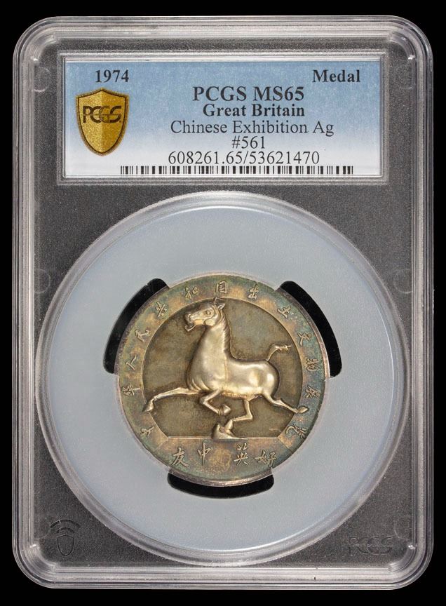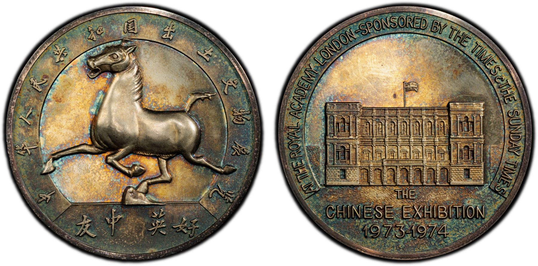 GREAT BRITAIN: AR medal, 1974, 51mm silver medal by Toye, Kenning & Spencer Ltd., in association with the Times and the Sunday Times, commemorating the Chinese Historical Relic Exhibition held in the Royal Academy of London in 1973-1974; the 'Flying Horse of Gansu' and Chinese legend // "Chinese Exhibition 1973-1974" below building and English legend AT THE ROYAL ACADEMY LONDON / SPONSORED BY THE TIMES & THE SUNDAY TIMES around, mintage of 2,000 pieces, scarce, with original informational paper and case of issue, a superb lightly toned mint state example! PCGS graded MS65.