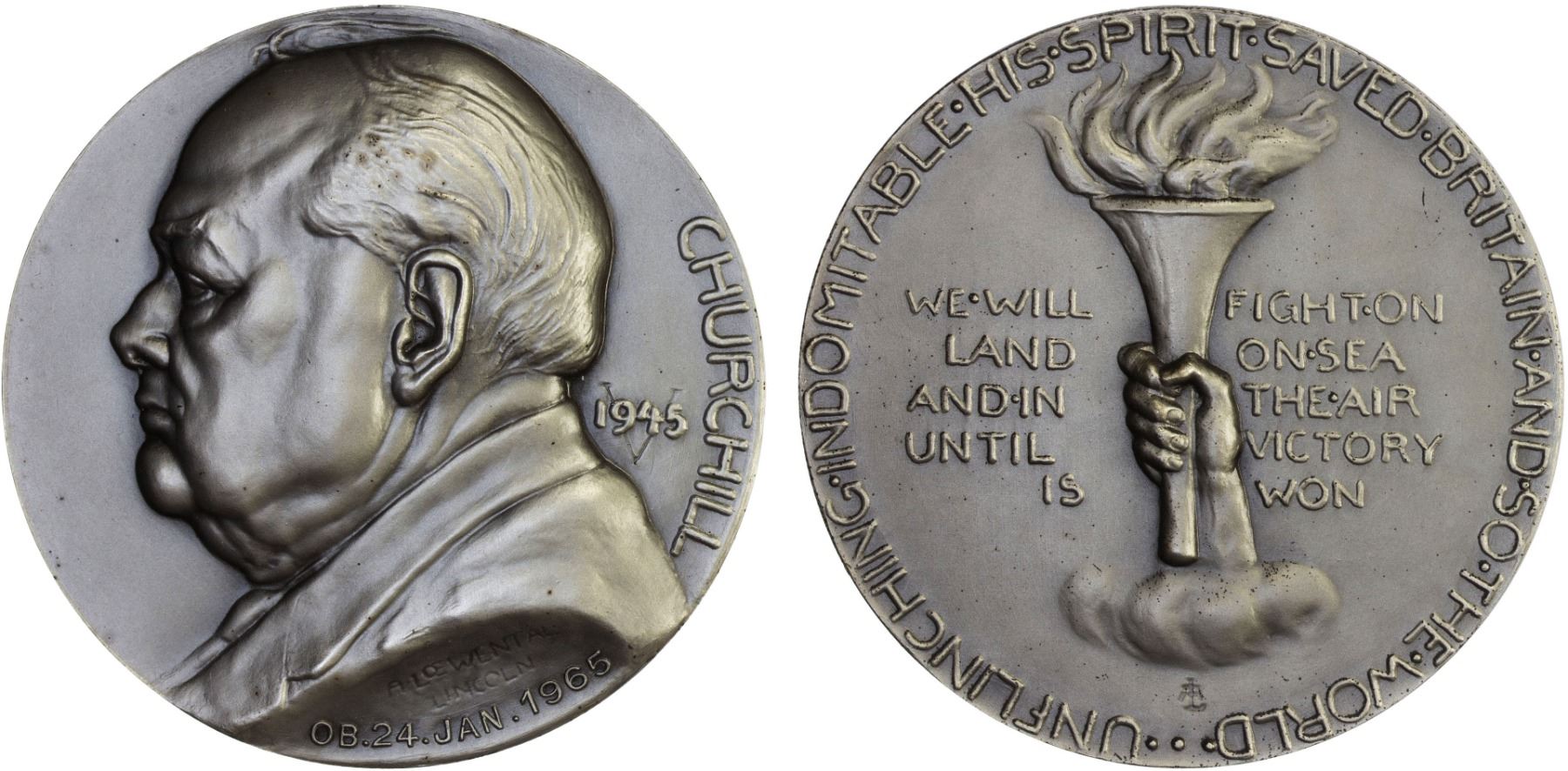 GREAT BRITAIN: AR medal (76.60g), 1965, Engstrom-35, 50mm .958 fine silver medal for the Death of Winston Churchill by A. Loewental, bust of Churchill left with CHURCHILL around right edge with "1945" superimposed on incuse V in right field and OB 24 JAN 1965 at bottom // hand rishing from cloud, holding torch with WE WILL - FIGHT ON / LAND - ON SEA / AND IN - THE AIR / UNTIL - VICTORY / IS - WON at sides, and with UNFLINCHING INDOMITABLE HIS SPIRIT SAVED BRITAIN AND SO THE WORLD around, matte finish, in original plush (worn) Seaby case, plain edge, Choice Unc. This medal is a reissue of the 1945 Loewental medal in a smaller size and with the addition of the date of death.