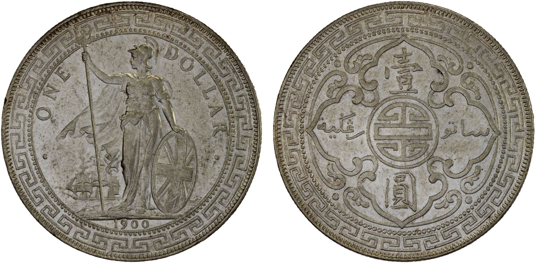GREAT BRITAIN: AR trade dollar, 1900-B, KM-T5, cleaned and hairlined but attractive, AU. The British Trade Dollar was designed by George William De Saulles and minted from 1895 for Hong Kong and the Straits Settlements. But after the Straits dollar was introduced in 1903, it became exclusively a Hong Kong coin produced until 1935.