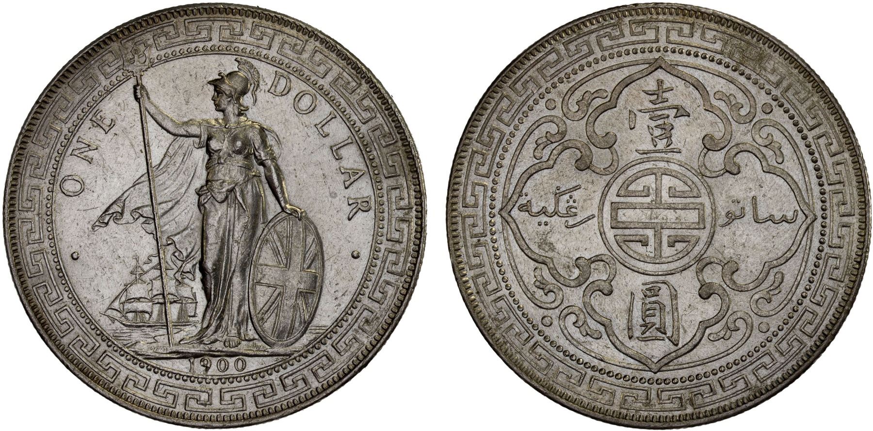 GREAT BRITAIN: AR trade dollar, 1900-B, KM-T5, light surface hairlines, AU. The British Trade Dollar was designed by George William De Saulles and minted from 1895 for Hong Kong and the Straits Settlements. But after the Straits dollar was introduced in 1903, it became exclusively a Hong Kong coin produced until 1935.