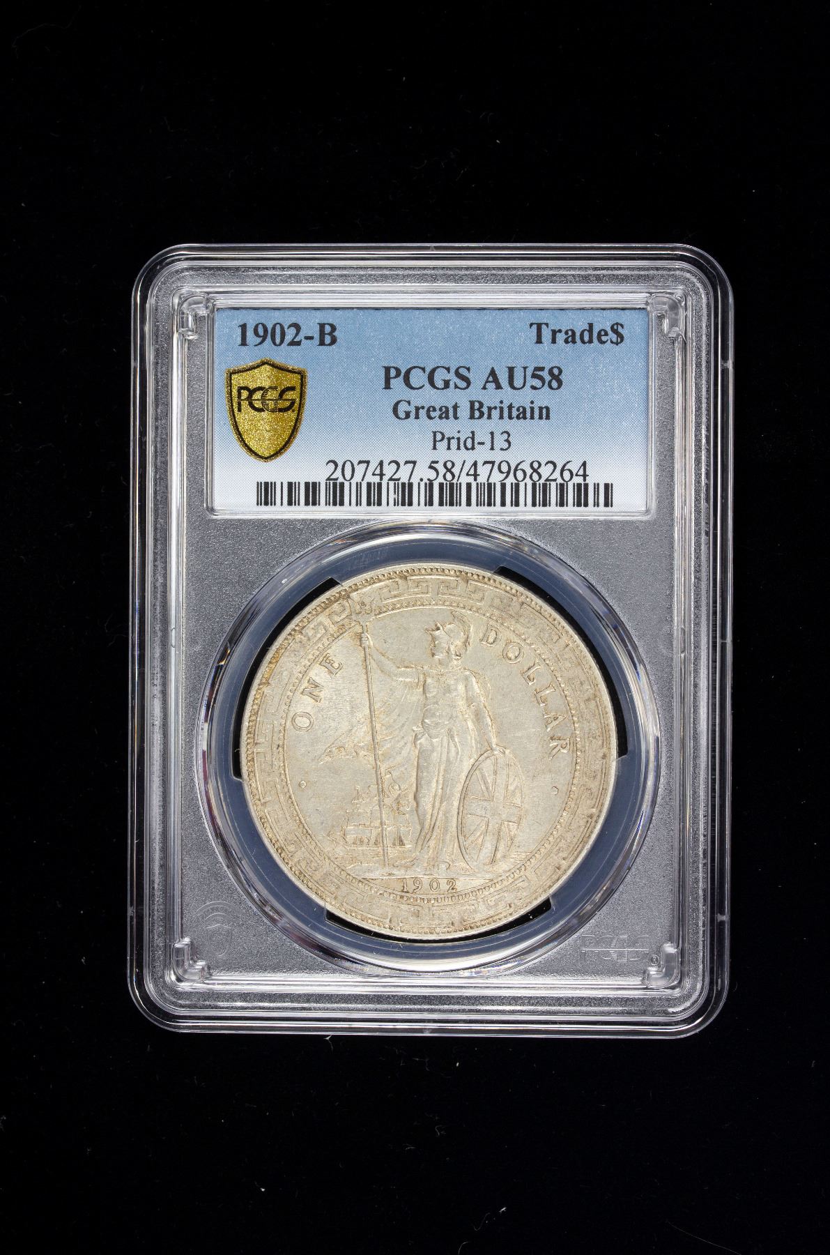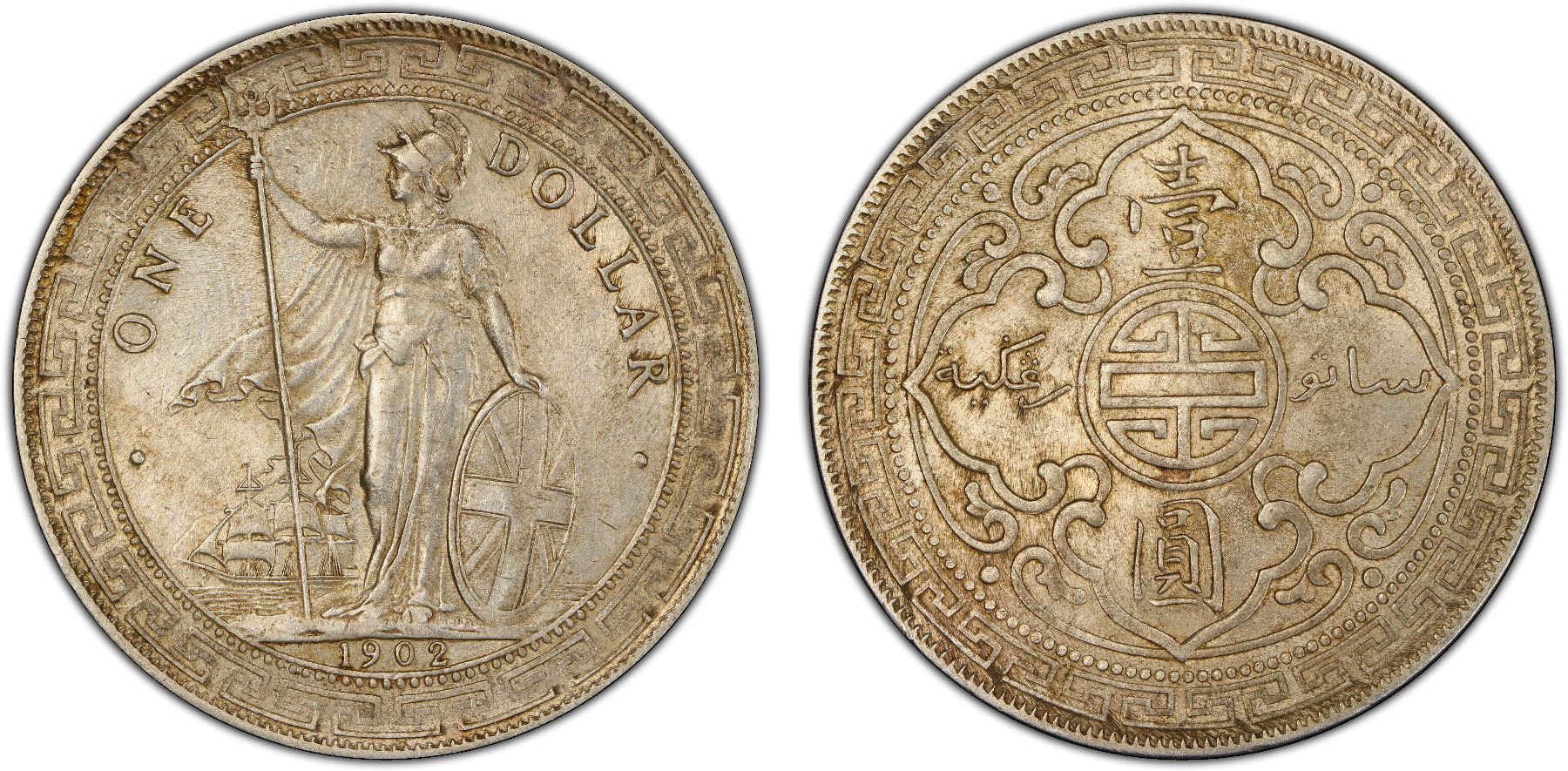 GREAT BRITAIN: AR trade dollar, 1902-B, KM-T5, struck at the Bombay Mint, India, PCGS graded AU58. The British Trade Dollar was designed by George William De Saulles and minted from 1895 for Hong Kong and the Straits Settlements. But after the Straits dollar was introduced in 1903, it became exclusively a Hong Kong coin produced until 1935.