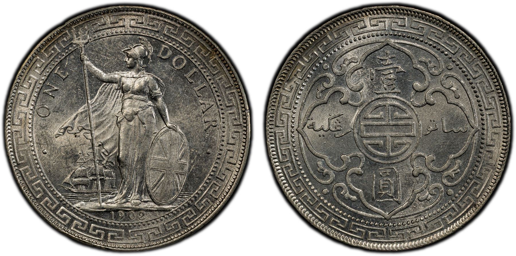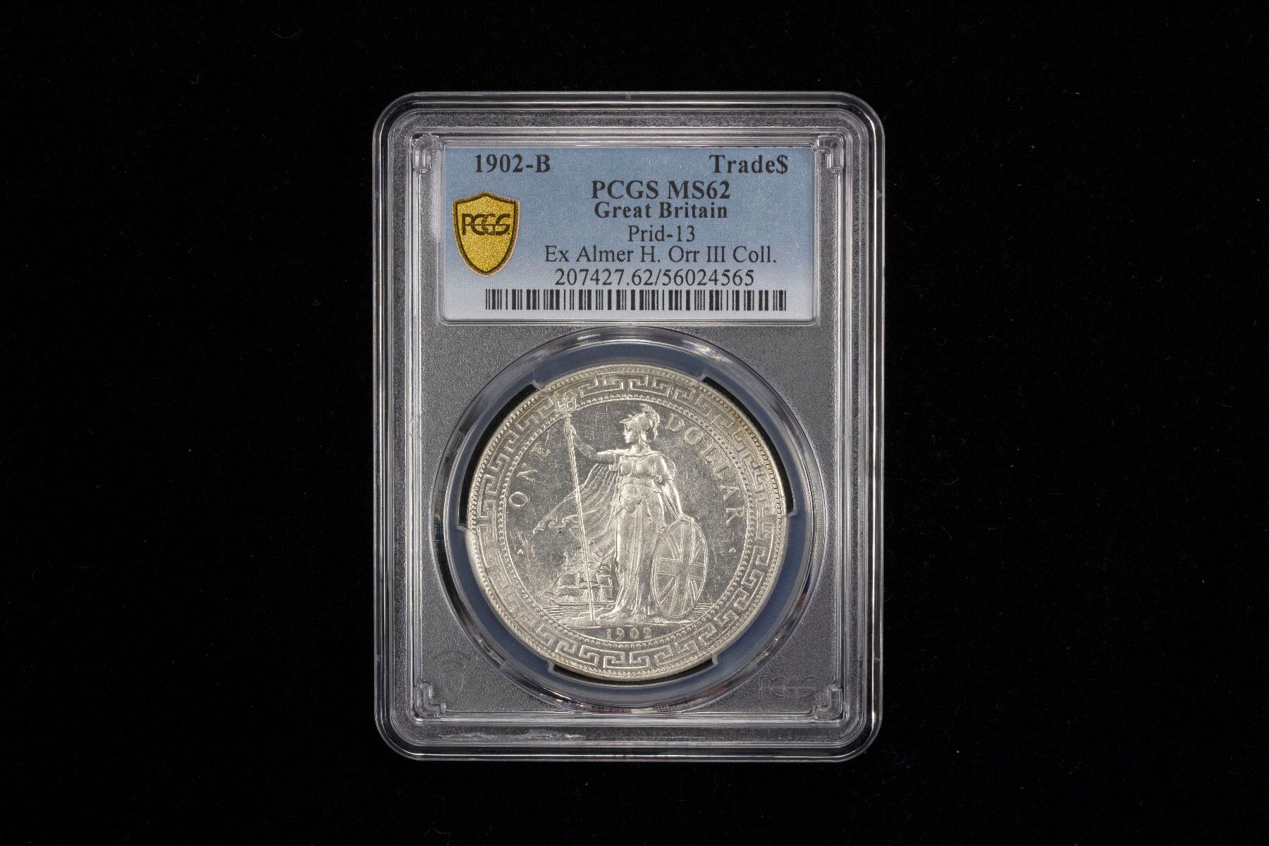 GREAT BRITAIN: AR trade dollar, 1902-B, KM-T5, a pleasing lustrous example, PCGS graded MS62. The British Trade Dollar was designed by George William De Saulles and minted from 1895 for Hong Kong and the Straits Settlements. But after the Straits dollar was introduced in 1903, it became exclusively a Hong Kong coin produced until 1935.