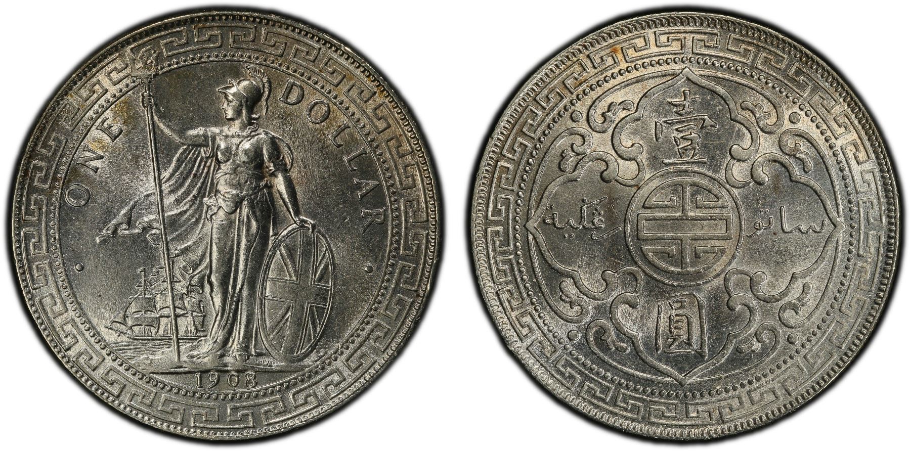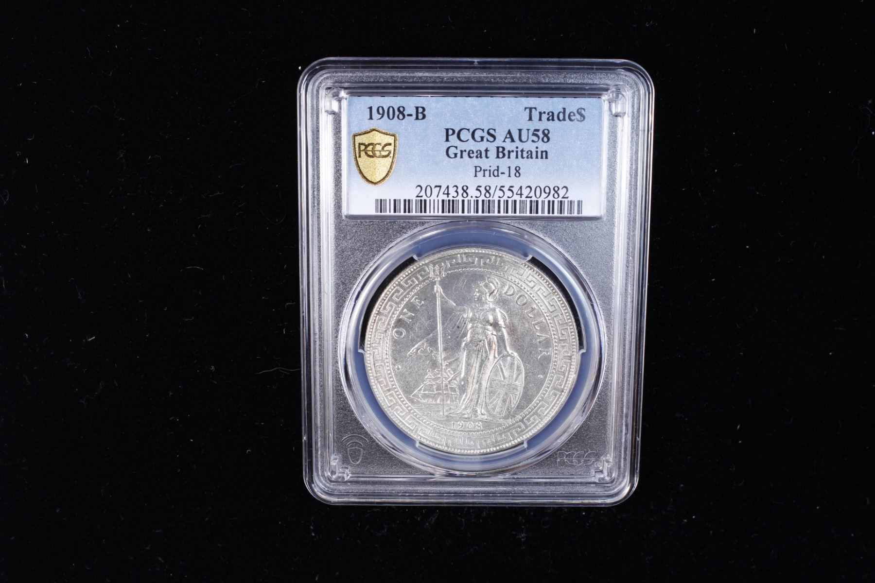 GREAT BRITAIN: AR trade dollar, 1908-B, KM-T5, an attractive nearly mint state example, PCGS graded AU58. The British Trade Dollar was designed by George William De Saulles and minted from 1895 for Hong Kong and the Straits Settlements. But after the Straits dollar was introduced in 1903, it became exclusively a Hong Kong coin produced until 1935.