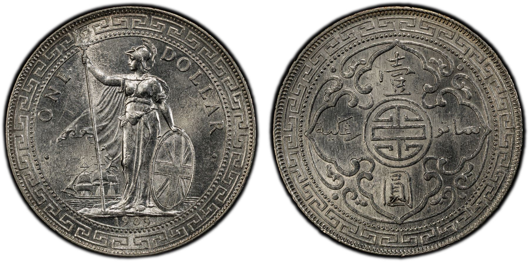 GREAT BRITAIN: AR trade dollar, 1909-B, KM-T5, a pleasing lustrous example, PCGS graded MS62. The British Trade Dollar was designed by George William De Saulles and minted from 1895 for Hong Kong and the Straits Settlements. But after the Straits dollar was introduced in 1903, it became exclusively a Hong Kong coin produced until 1935.