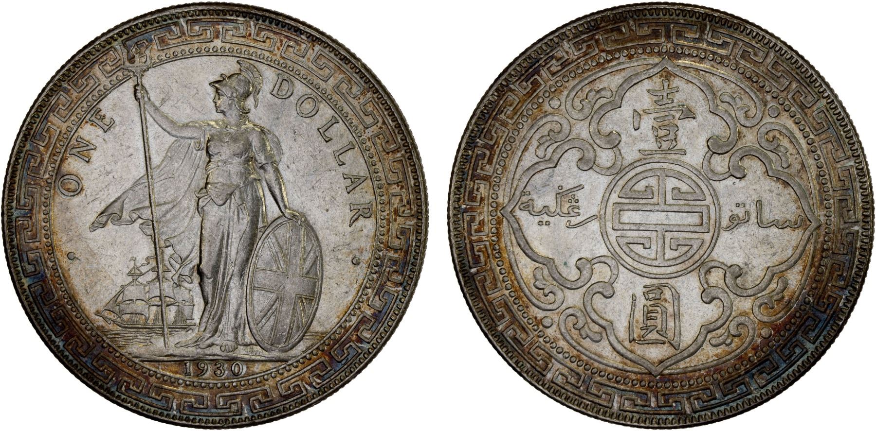 GREAT BRITAIN: AR trade dollar, 1930-B, KM-T5, surface hairlines, lustrous, AU. The British Trade Dollar was designed by George William De Saulles and minted from 1895 for Hong Kong and the Straits Settlements. But after the Straits dollar was introduced in 1903, it became exclusively a Hong Kong coin produced until 1935.