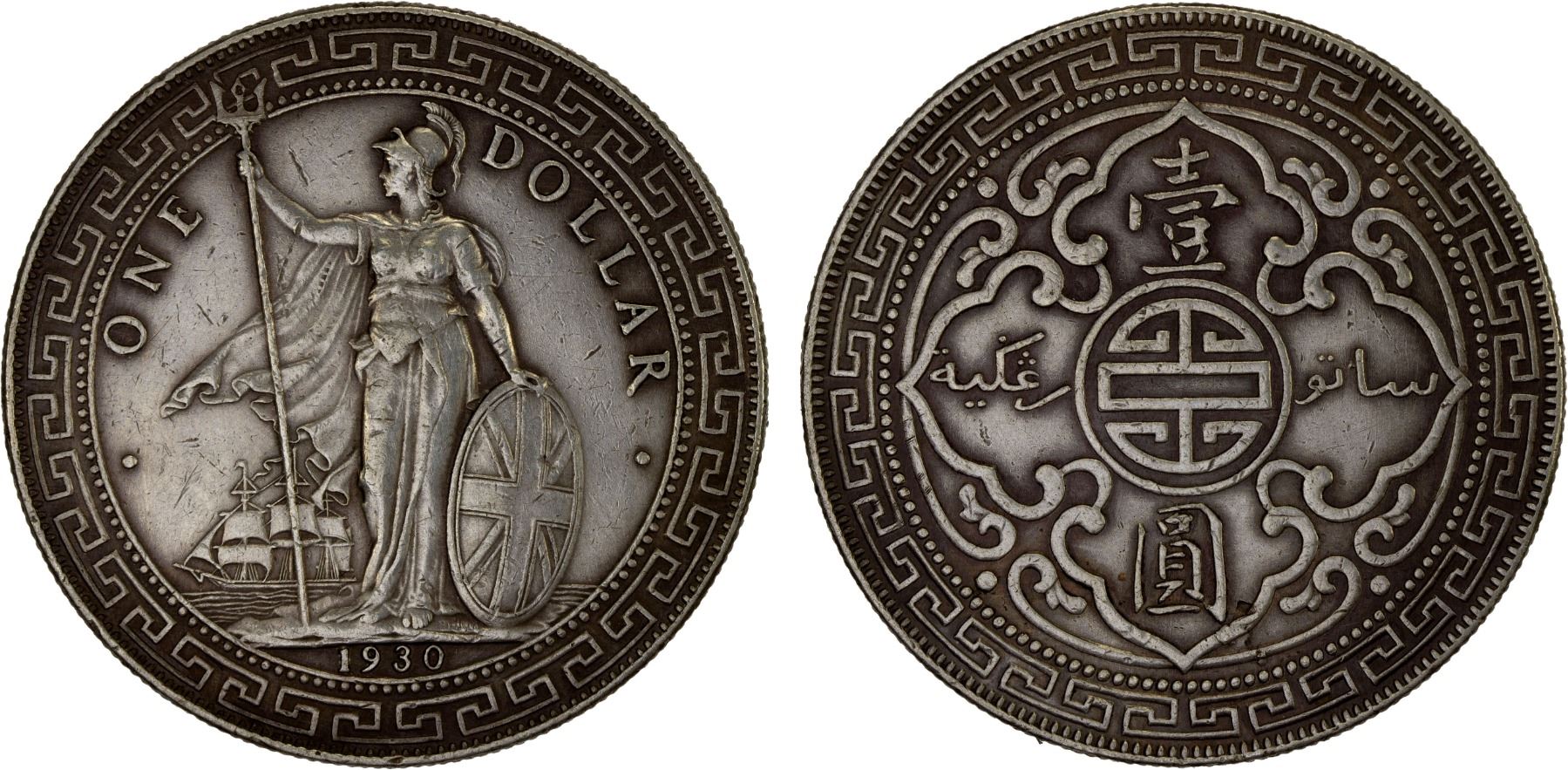 GREAT BRITAIN: AR trade dollar, 1930-B, KM-T5, once lightly cleaned, NGC graded About XF, ex Salvatore J. Falcone Collection. The British Trade Dollar was designed by George William de Saulles and minted from 1895 for Hong Kong and the Straits Settlements. But after the Straits dollar was introduced in 1903, it became exclusively a Hong Kong coin produced until 1935.