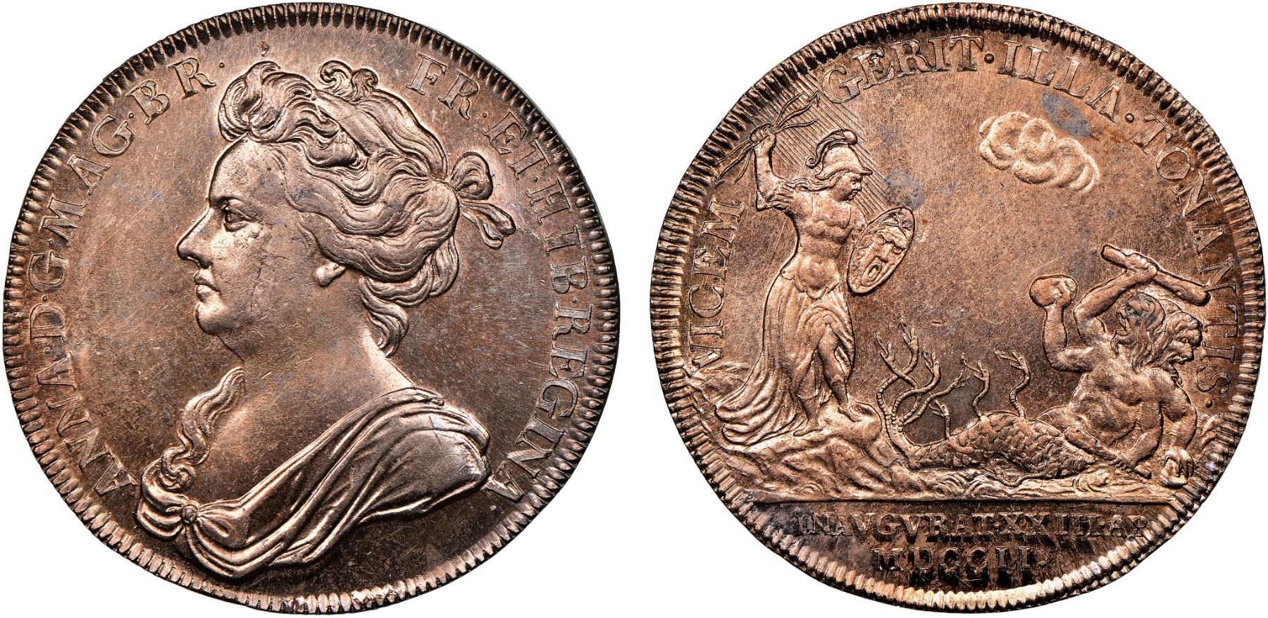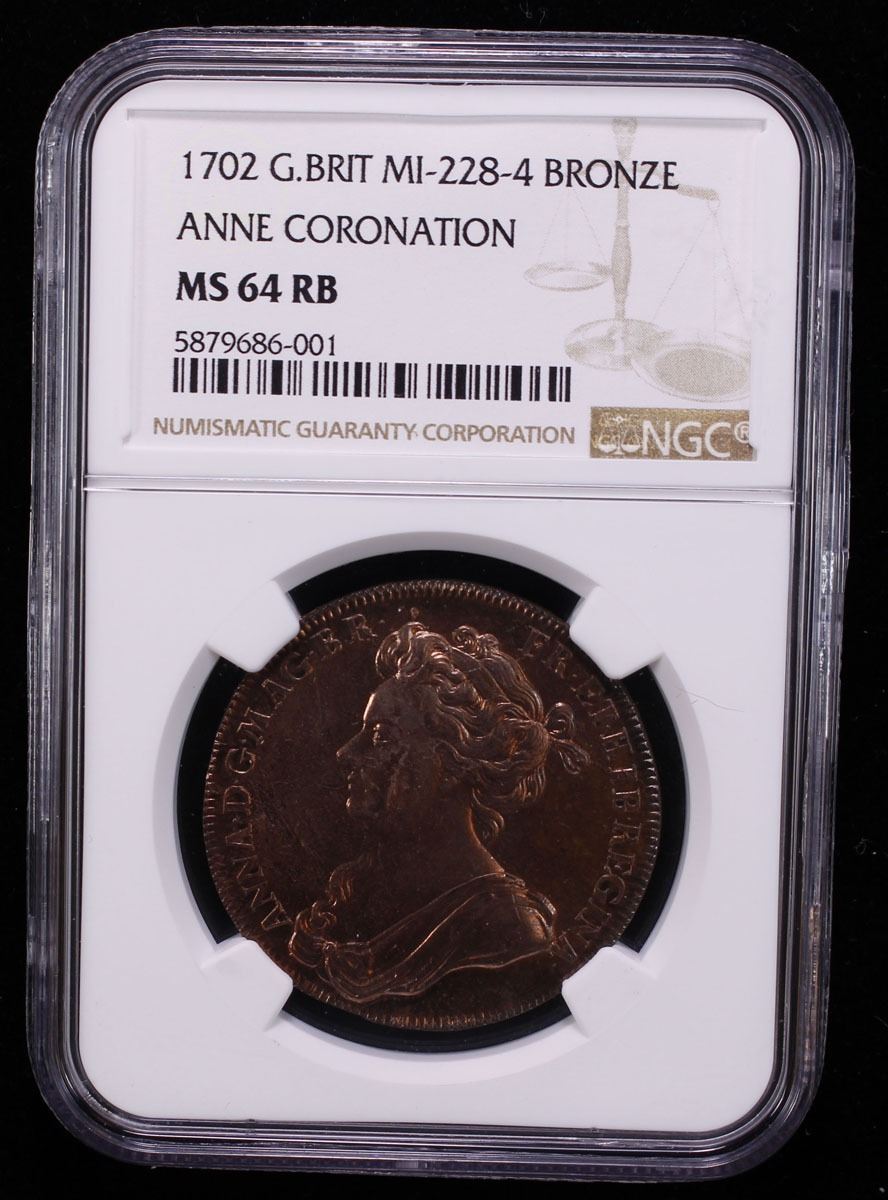 GREAT BRITAIN: Anne, 1702-1714, AE coronation medal, 1702, MI-228-4, Eimer-390, 39mm, engraved by J. Croker, diademed and draped bust of Anne left // Anne (as Pallas-Athena) standing right holding shield and hurling thunderbolt at two-headed and four-armed serpentine monster (representing James III [the Old Pretender] and Louis XIV of France) to right, holding rocks and clubs, coronation date (April 23, 1702) in exergue, in Latin and Roman numerals, in a remarkable state of preservation with almost full red luster, NGC graded MS64 RB. This medal conveys the real threat seen by England in the form of a Jacobite-French alliance, and how much the former relied upon the success of Anne in stabilizing the post-Stuart England, soon to formally join with Scotland in the form of the United Kingdom.Tied with only one other example for the highest graded (Top Pop) at NGC.