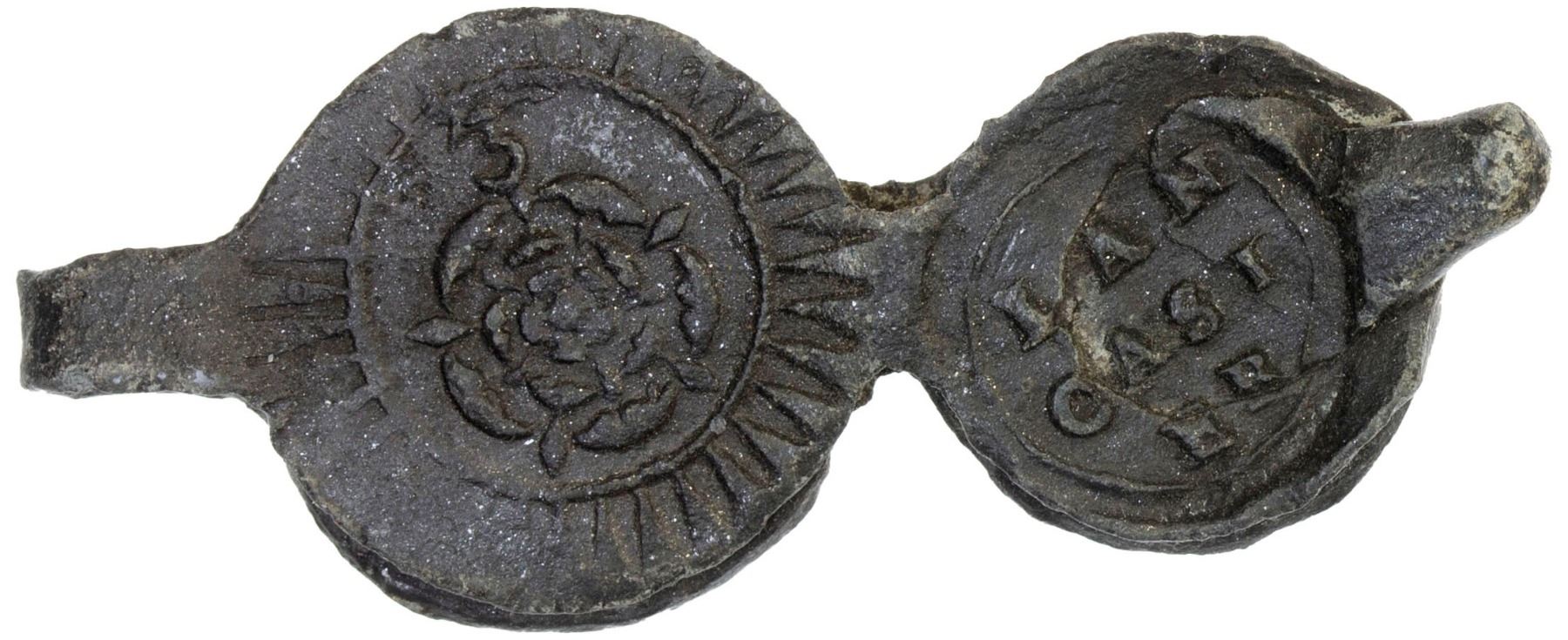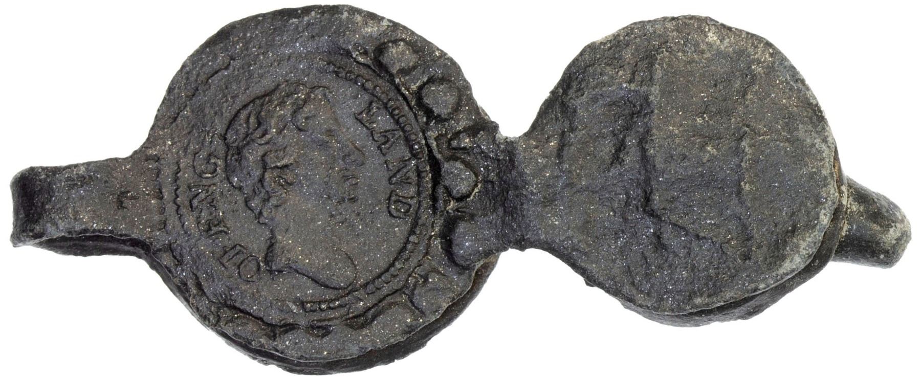 GREAT BRITAIN: Charles II, 1660-1685, bale seal (8.63g), ND, cast lead bale seal, portrait of Charles II with OF ENG- - LAND around with dot border around and indistinct design on adjacent disc // English rose with "3" above within inner circle and with dentilated border and LAND / CAST / ER on adjacent disc, amazingly well preserved, VF-XF.