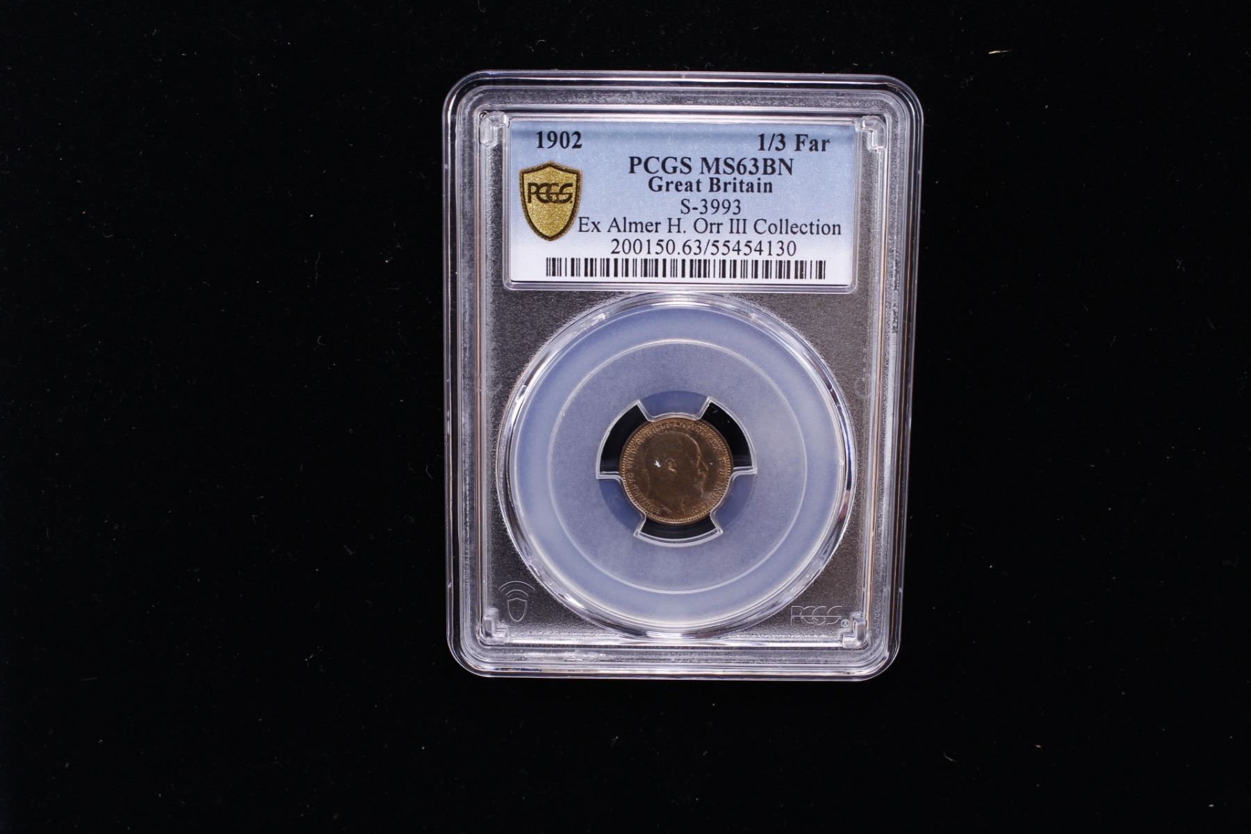 GREAT BRITAIN: Edward VII, 1901-1910, AE 1/3 farthing, 1902, KM-791, S-3993, some red, one-year type, PCGS graded MS65 RD, ex Almer H. Orr III Collection. Struck for use in Malta, where they corresponded in value with the old Maltese grano, third-farthings were never legal tender in the United Kingdom.