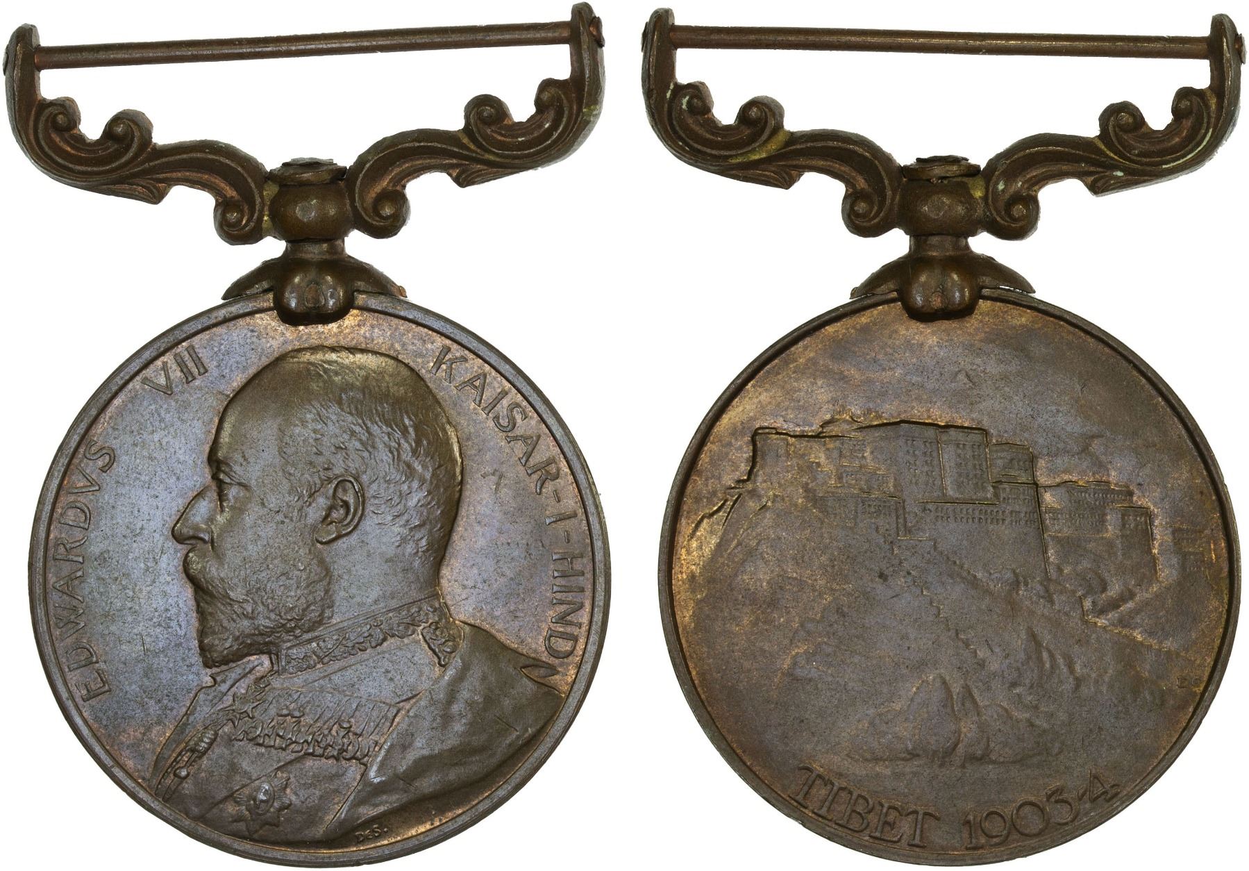 GREAT BRITAIN: Edward VII, 1901-1910, AE medal, 37mm bronze Tibet Expedition medal by G.W. de Saulles and E.G. Gillick, uniformed bust left with EDWARDVS VII - KAISAR-I-HIND around // fortress of Potala Lhassa with "TIBET 1903-4" below, with ornate hanger, with GYANTSE campaign bar, "1766 Cooly Seering S. & J. Corps " engraved in cursive script on edge, AU. In July 1903, an expeditionary force was assembled under Colonel Francis Younghusband and encountered the Tibetan Army at Tanu. The Tibetans were forcibly disarmed, and the Dalai Lama refused to negotiate a peace as the British force advanced to Gyantse. The Tibetans surrounded and attacked the British, but were decisively defeated. A peace treaty was finally signed in the Portala Lhassa on August 4, 1904. The Tibet Medal was authorized in February 1905 for all members of the Tibet Mission and accompanying troops who served at or beyond Siliguri from December 13, 1903, to September 23, 1904.