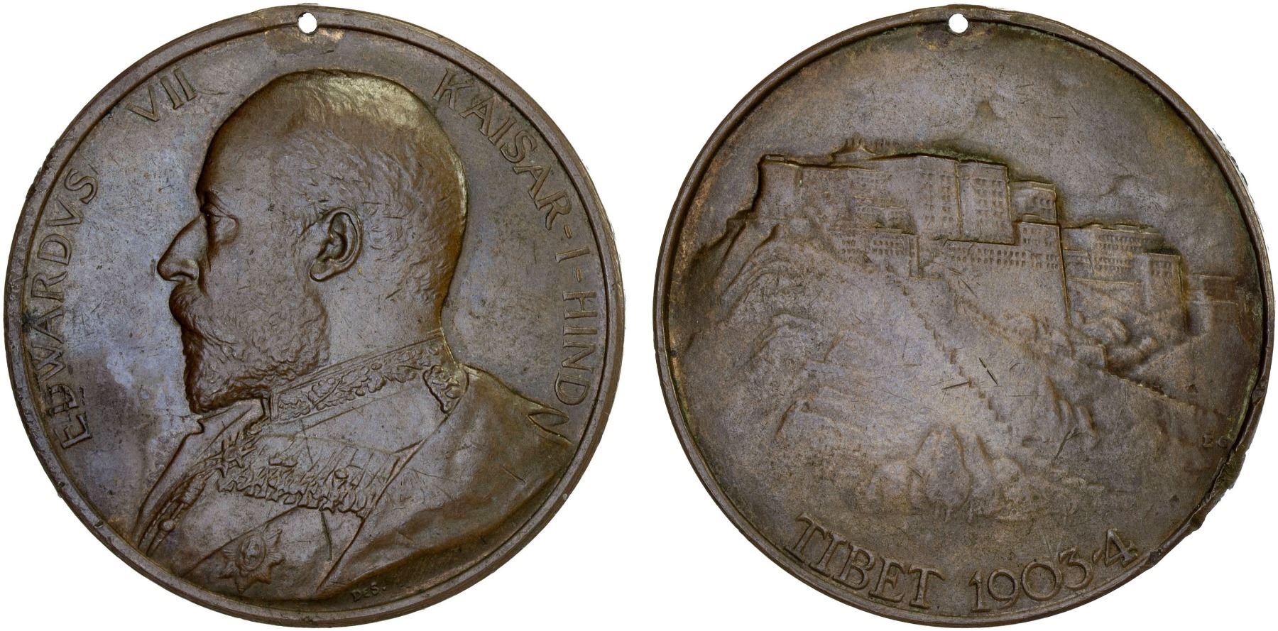 GREAT BRITAIN: Edward VII, 1901-1910, AE medal, 37mm bronze Tibet Expedition medal by G.W. de Saulles and E.G. Gillick, uniformed bust left with EDWARDVS VII - KAISAR-I-HIND around // fortress of Potala Lhassa with TIBET 1903-4 below, with ornate hanger, with GYANTSE campaign bar, "1766 Cooly Seering S. & J. Corps " engraved in cursive script on edge, AU. In July 1903, an expeditionary force was assembled under Colonel Francis Younghusband and encountered the Tibetan Army at Tanu. The Tibetans were forcibly disarmed, and the Dalai Lama refused to negotiate a peace as the British force advanced to Gyantse. The Tibetans surrounded and attacked the British, but were decisively defeated. A peace treaty was finally signed in the Portala Lhassa on August 4, 1904. The Tibet Medal was authorized in February 1905 for all members of the Tibet Mission and accompanying troops who served at or beyond Siliguri from December 13, 1903, to September 23, 1904.