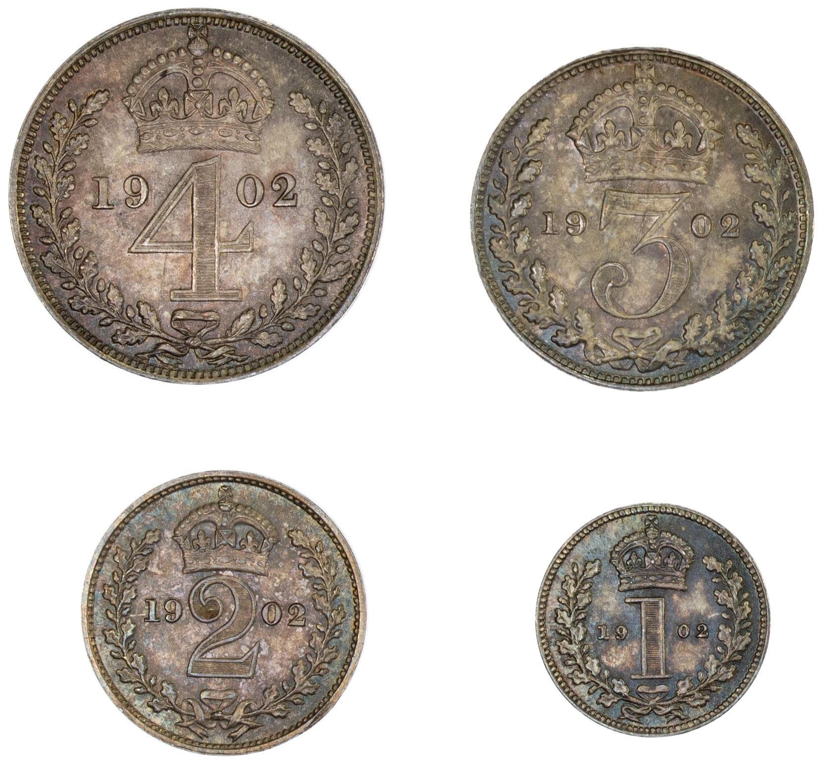 GREAT BRITAIN: Edward VII, 1901-1910, AR maundy set, 1902, KM-MDS158, Spink-3985, beautifully toned, no box, mintage of only 8,976 sets, scarce, set of 4 pieces, Choice UNC.