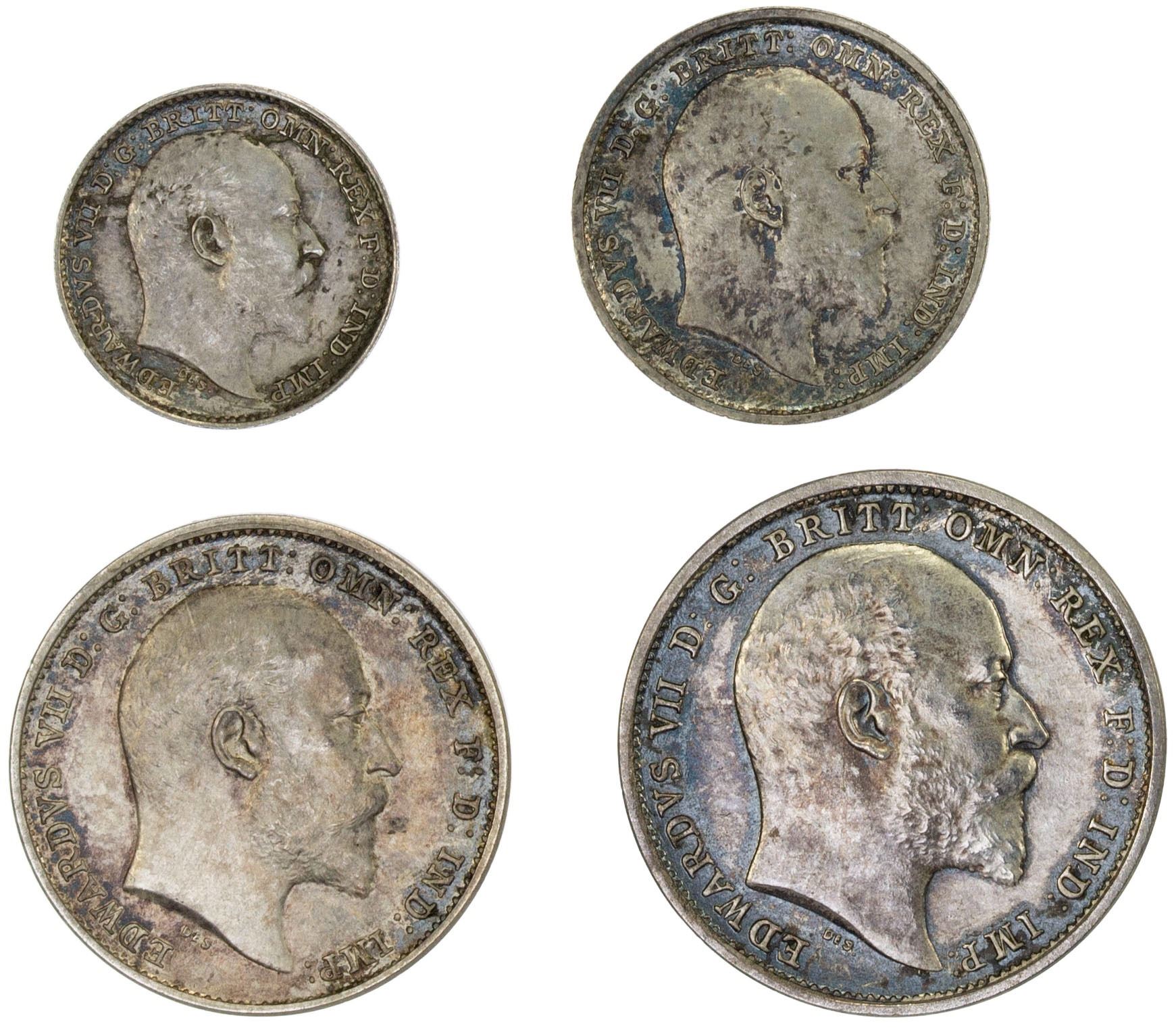 GREAT BRITAIN: Edward VII, 1901-1910, AR maundy set, 1902, KM-MDS158, Spink-3985, somewhat unevenly toned, coins have a matte appearance, set of 4 coins, Unc, ex Heritage Auction 231734, Lot 64228.