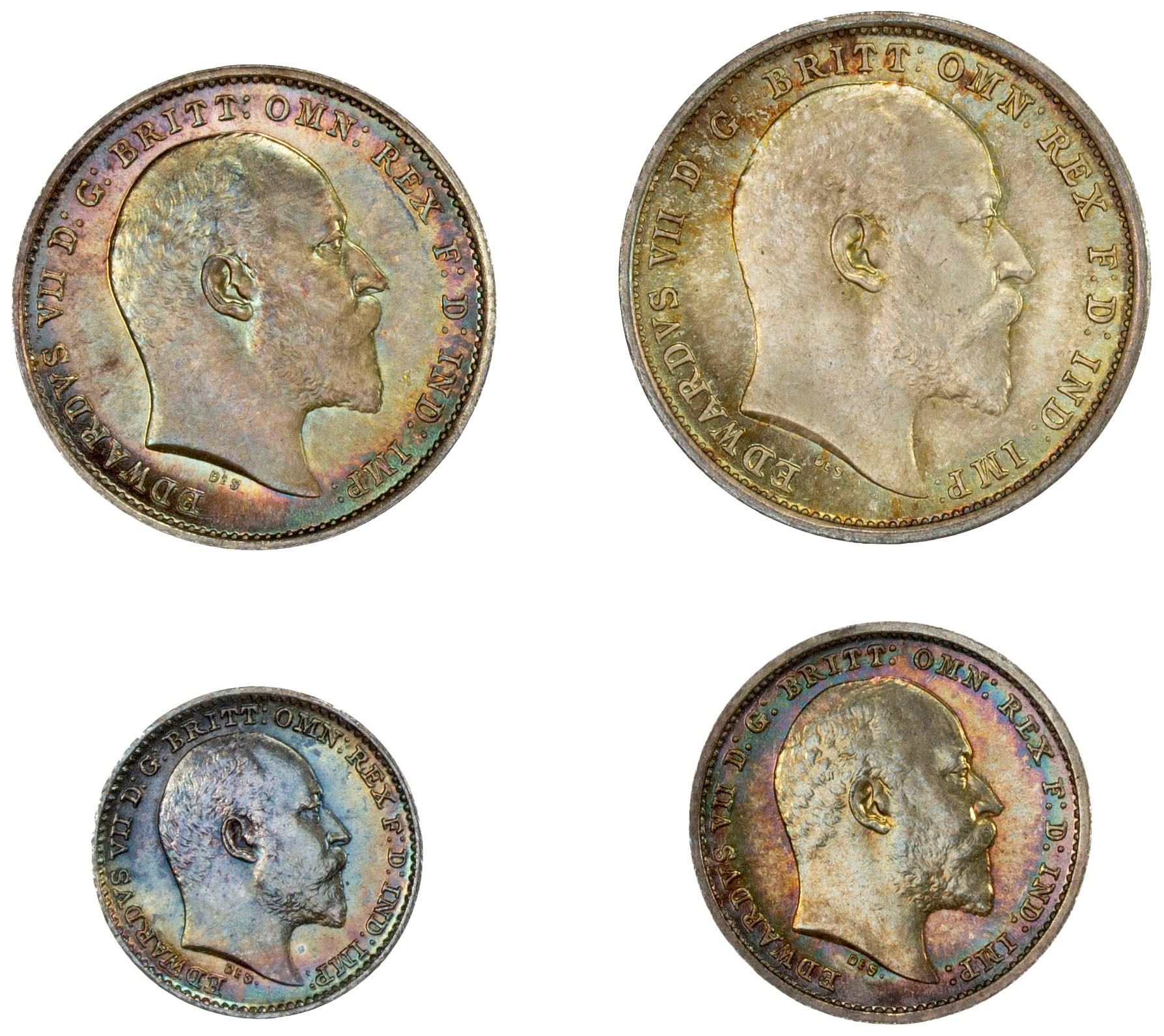 GREAT BRITAIN: Edward VII, 1901-1910, AR maundy set, 1903, KM-MDS160, Spink-3985, all are nicely toned, penny has a few hairlines, otherwise choice uncirculated, mintage of only 8,976 sets, scarce, set of 4 coins.