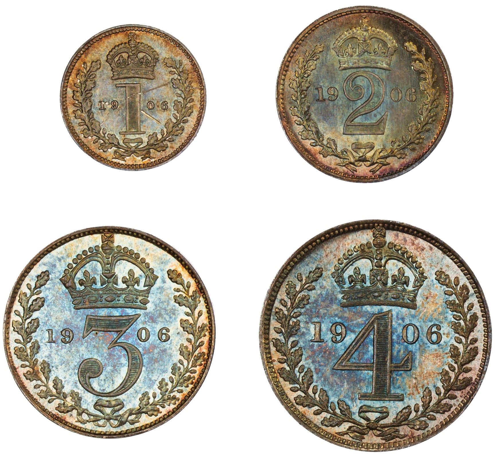 GREAT BRITAIN: Edward VII, 1901-1910, AR maundy set, 1906, KM-MDS163, Spink-3985, all are nicely toned, penny has two small field scratches, otherwise choice uncirculated, mintage of only 8,800 sets, scarce, set of 4 coins.
