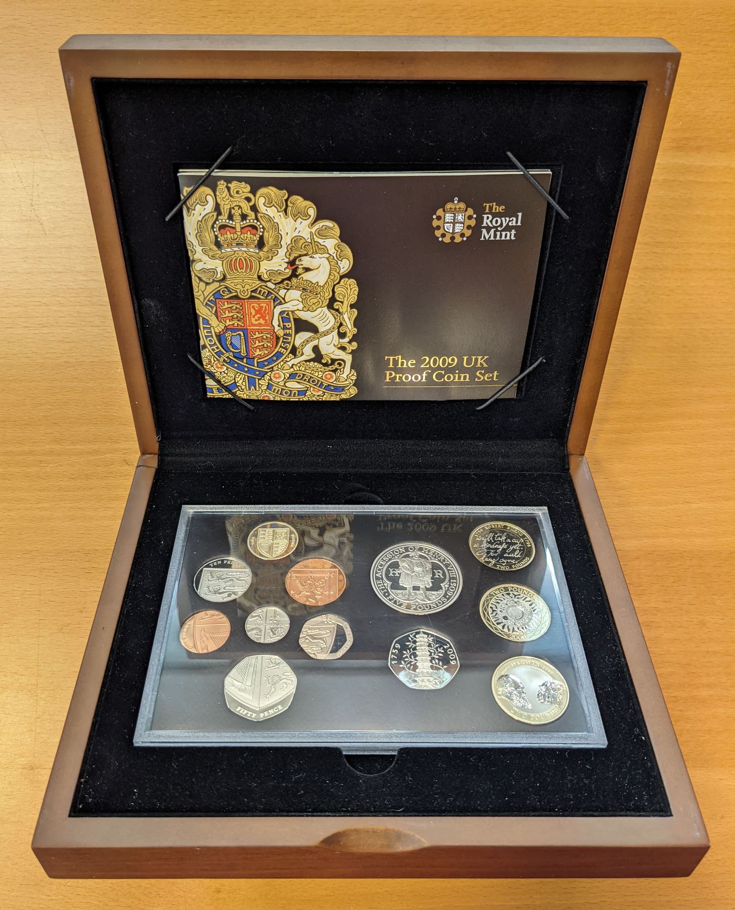 GREAT BRITAIN: Elizabeth II, 1952-, 12-coin proof set, 2009, SET of 12 coins including; 500th Anniversary of Accession of Henry VIII in 1509 crown, Bicentenary of the Birth of Charles Darwin 2 pounds, 250th Anniversary of the Birth of Robert Burns 2 pounds, 250th Anniversary of the Foundation of the Royal Botanic Gardens at Kew 50 pence, plus the standard types for the 1, 2, 5, 10, 20, 50 pence and 1 and 2 pound coins, all set in the lovely wooden case of issue from the Royal Mint, set of 12 coins.