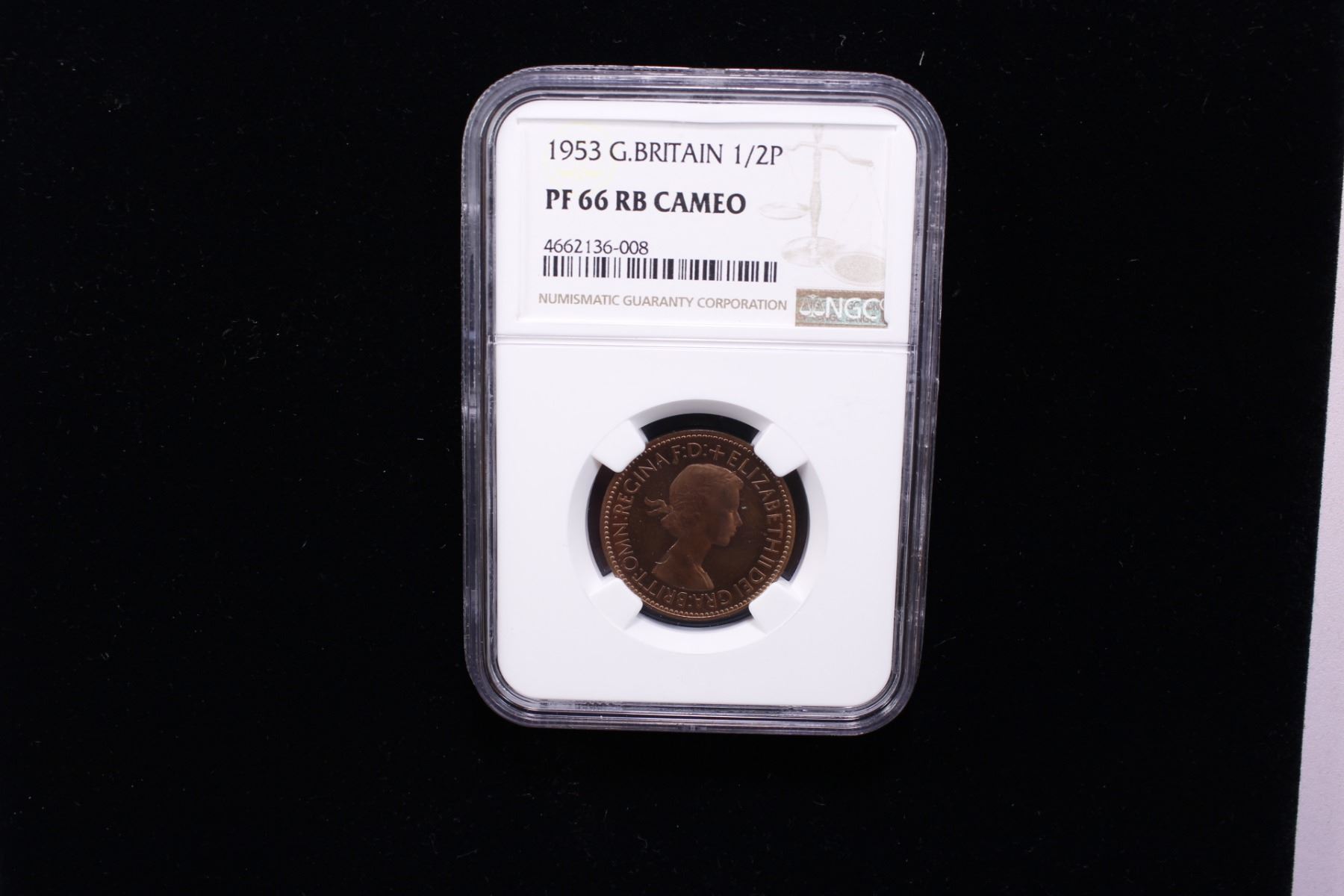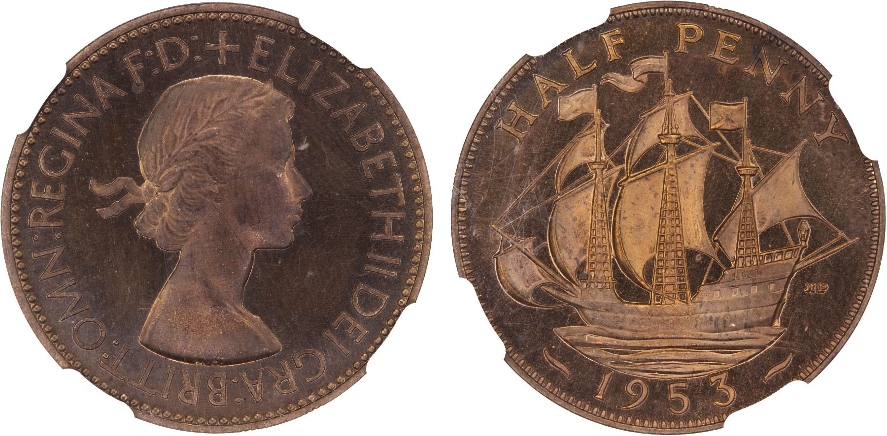 GREAT BRITAIN: Elizabeth II, 1952-2022, AE halfpenny (5.74g), 1953, NGC Proof 66 RB Cameo
