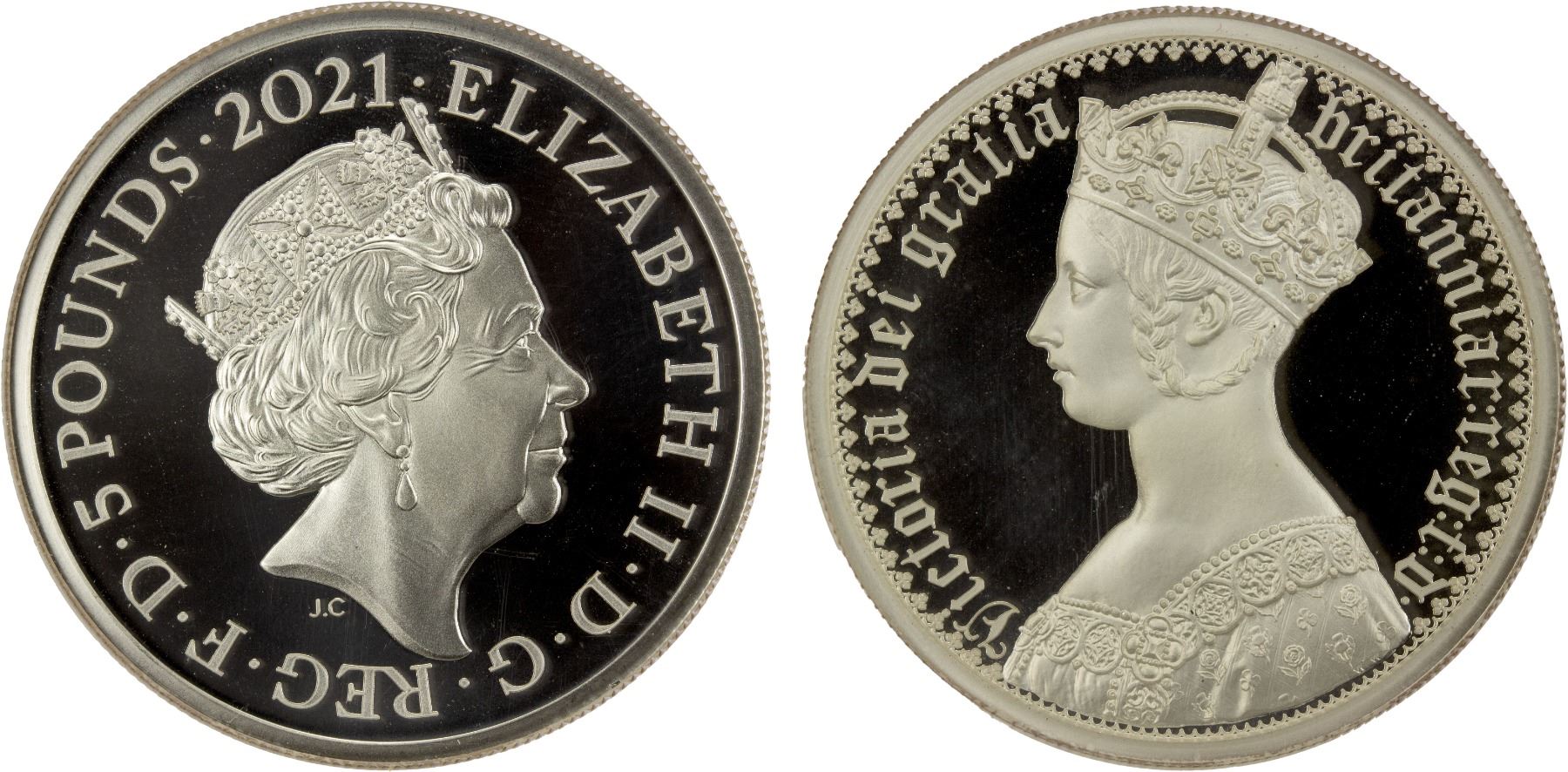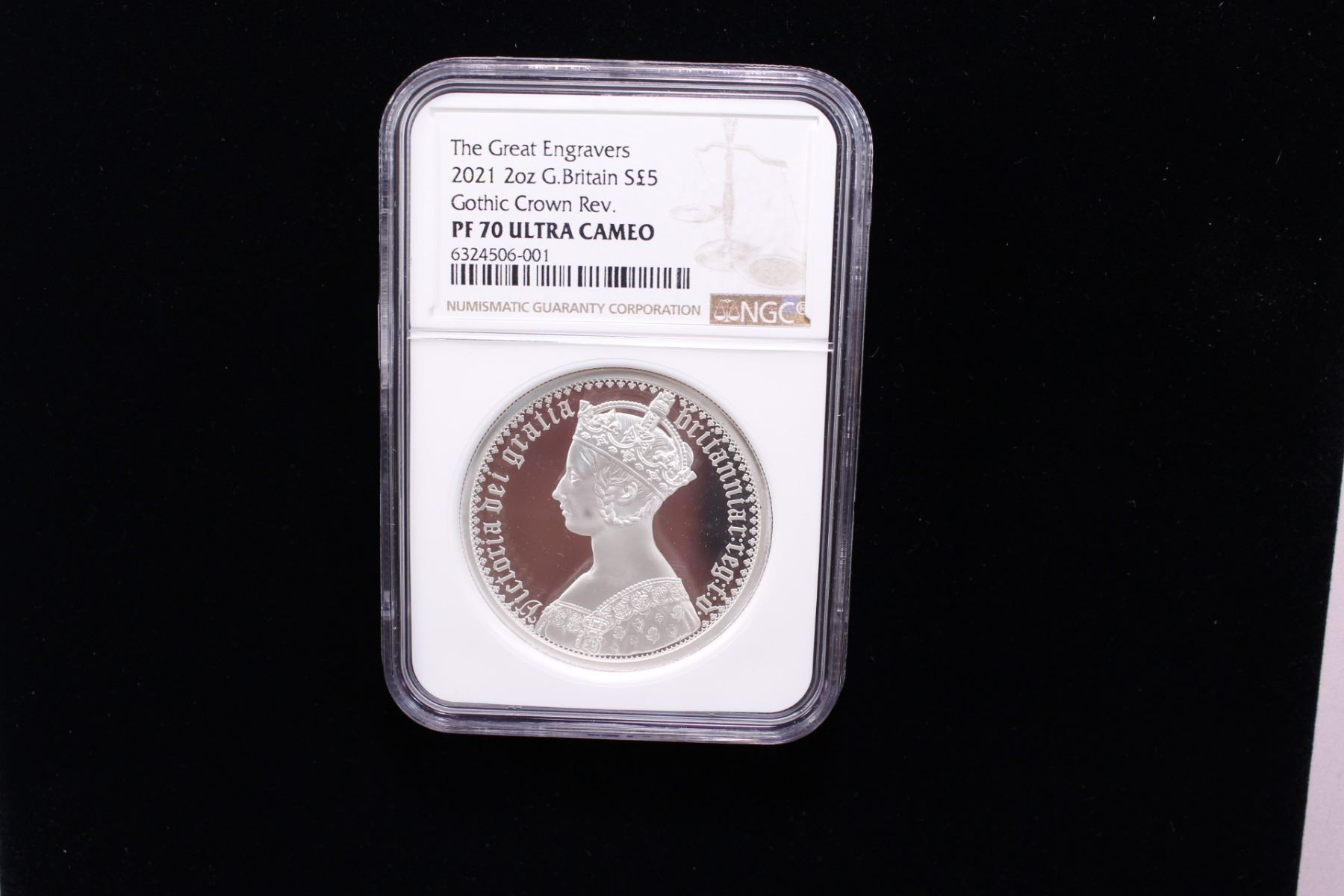 GREAT BRITAIN: Elizabeth II, 1952-2022, AR 5 pounds, 2021, KM-2036, S-GE19, The Great Engravers Series - Gothic Crown Portrait, NGC graded PF70 Ultra Cameo. A re-interpretation of William Wyon's original Gothic Crown obverse from 1847, the fourth in a series of coins in the Great Engravers series. This was struck in 2 troy ounces of pure silver.