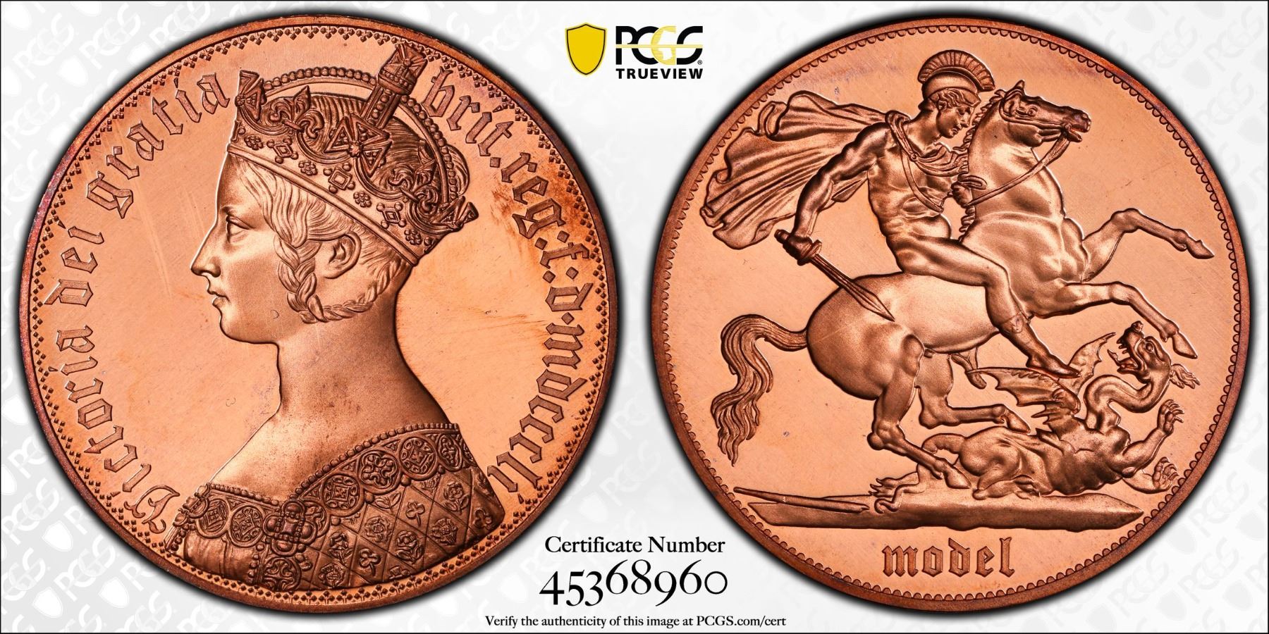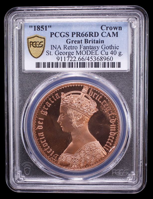 GREAT BRITAIN: Fantasy Issues, 1 crown, "1851", INA Retro Fantasy copper "Gothic" type of Victoria, MODEL variety, International Numismatic Agency(INA) issue, PCGS graded PF66 Red Cameo. The International Numismatic Agency (INA) struck high quality fantasy British crown coins primarily around 2000–2001, with additional, subsequent strikings reported in 2007 and 2008. These coins are often referred to as "INA Retro Fantasy Issues."