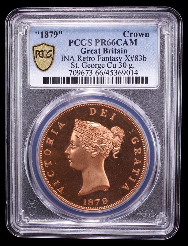 GREAT BRITAIN: Fantasy Issues, 1 crown, "1879", KM-X83b, INA Retro Fantasy copper type of Victoria, International Numismatic Agency(INA) issue, PCGS graded PF66 Cameo. The International Numismatic Agency (INA) struck high quality fantasy British crown coins primarily around 2000–2001, with additional, subsequent strikings reported in 2007 and 2008. These coins are often referred to as "INA Retro Fantasy Issues."