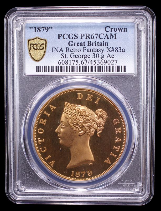 GREAT BRITAIN: Fantasy Issues, 1 crown, "1879", KM-X83b, INA Retro Fantasy copper type of Victoria, International Numismatic Agency(INA) issue, PCGS graded PF67 Cameo. The International Numismatic Agency (INA) struck high quality fantasy British crown coins primarily around 2000–2001, with additional, subsequent strikings reported in 2007 and 2008. These coins are often referred to as "INA Retro Fantasy Issues."