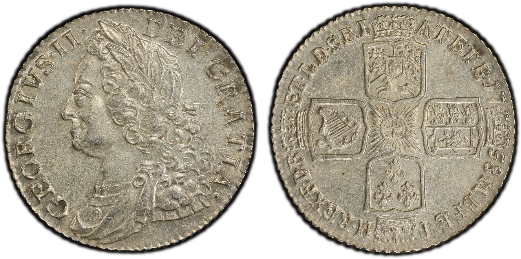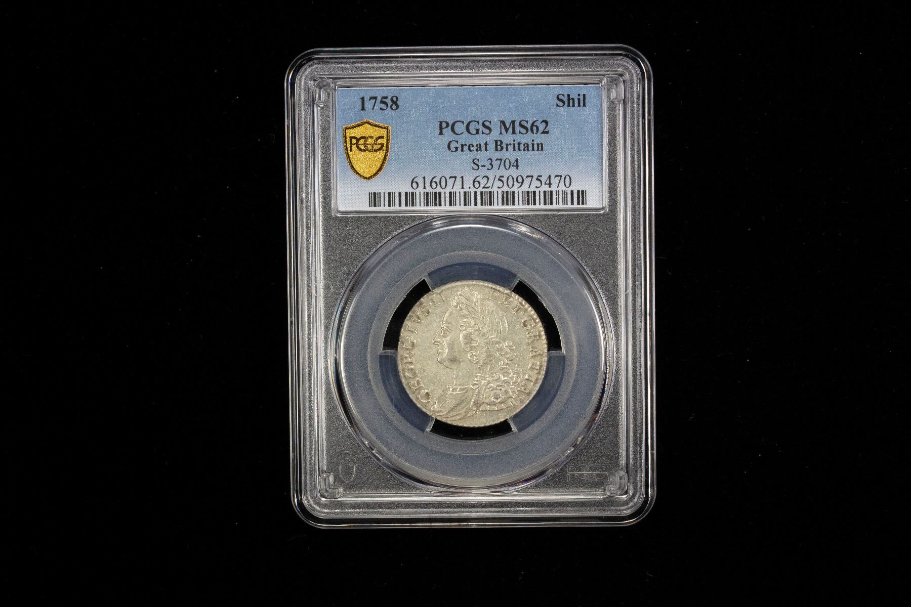 GREAT BRITAIN: George II, 1727-1760, AR shilling, 1758, KM-583.3, S-3704, a pleasing mint state example, PCGS graded MS62.